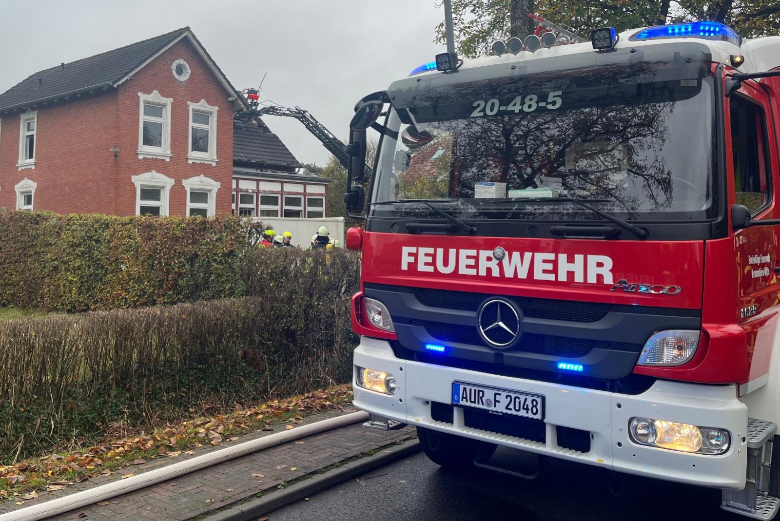 Als die ersten Kräfte der Feuerwehr vor Ort eintrafen, schlugen bereits Flammen aus den Fenstern eines Gebäudeteils, so Kilian Peters, Pressesprecher der Feuerwehr Krummhörn. Trupps unter Atemschutz hätten das Feuer durch den schnellen und effizienten Einsatz zügig unter Kontrolle bringen und somit ein Übergreifen auf den anderen Gebäudeteil verhindern können. Mit Hilfe der Drehleiter der Feuerwehr Emden seien Teile des Daches abgedeckt worden, um Glutnester ablöschen zu können.