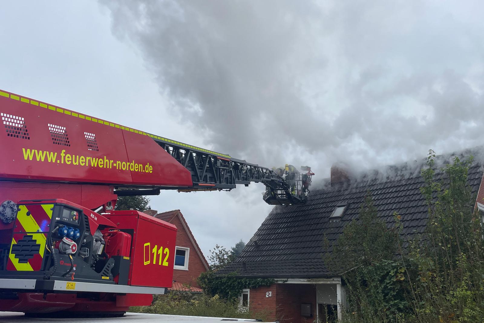 Eine ältere Frau haben Atemschutzgeräteträger der Freiwilligen Feuerwehr Norden am Montagvormittag aus einem brennendem Wohnhaus gerettet. Gegen 11.15 Uhr haben Anwohner und ein Norder Feuerwehrmann den Brand im Ortsteil Tidofeld entdeckt. Der Feuerwehrmann äußerte in seinem Notruf bereits den Verdacht, dass sich noch eine Frau in dem Einfamilienhaus in der Donaustraße befinden würde. Bei Ankunft der ersten Einsatzkräfte bestätigte sich das. Gewaltsam brachen sie die Haustür auf. Couragierte Nachbarn halfen den Feuerwehrleuten dabei. Die Frau im Qualm rief den Helfern zu. Atemschutzgeräteträger fanden sie dann im Inneren des Gebäudes unweit des Brandherdes. Zu diesem Zeitpunkt schlugen die Flammen bereits haushoch auf der Gebäuderückseite empor. Dichter Qualm drang aus dem gesamten Dachstuhl. Die gerettete Frau wurde dem Rettungsdienst übergeben und nach Aurich ins Krankenhaus gebracht. Sie war bei ihrer Rettung ansprechbar, so die Feuerwehr Norden in ihrem Bericht.