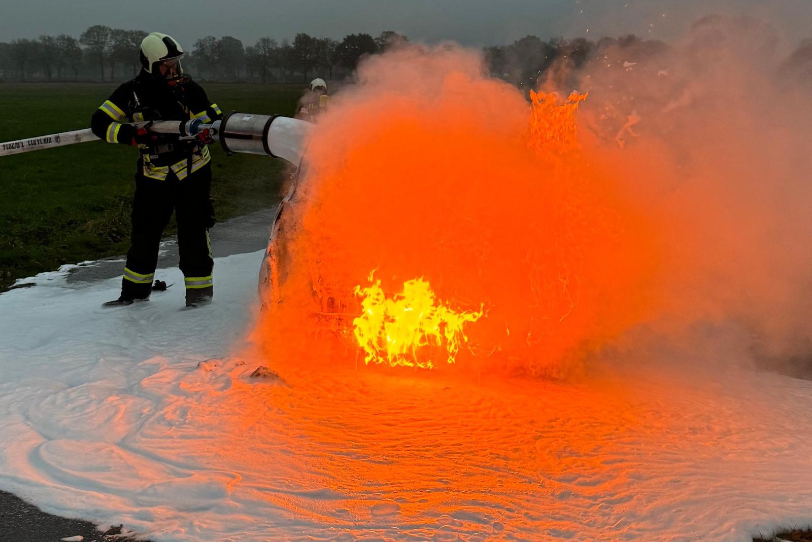Das benzinbetriebene Auto stand beim Eintreffen der Feuerwehr Middels bereits lichterloh in Flammen. Unter Atemschutz löschten die Feuerwehrleute zunächst mit Wasser und setzten anschließend auch Schaummittel ein, um den Brand zu bekämpfen. Mit einer Wärmebildkamera wurde die Karosserie währenddessen immer wieder auf Glutnester kontrolliert.