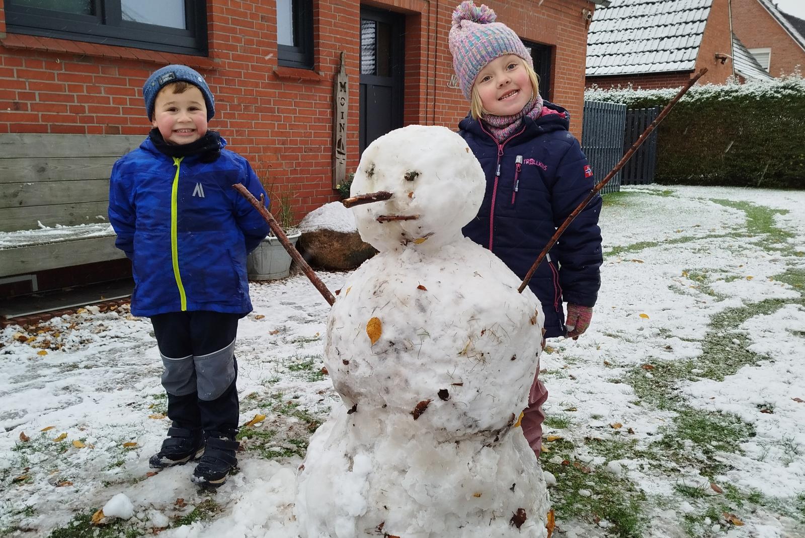 So mancher Autofahrer wurde gestern eiskalt erwischt vom Wintereinbruch, doch bei vielen überwog die Freude über die Flockenpracht. Auch Lenn und Ewa aus Diele waren in ihrem weißen Element: Weil die Kita geschlossen war, konnten die Nachbarskinder nach Herzenslust im Schnee stöbern und einen Schneemann bauen.