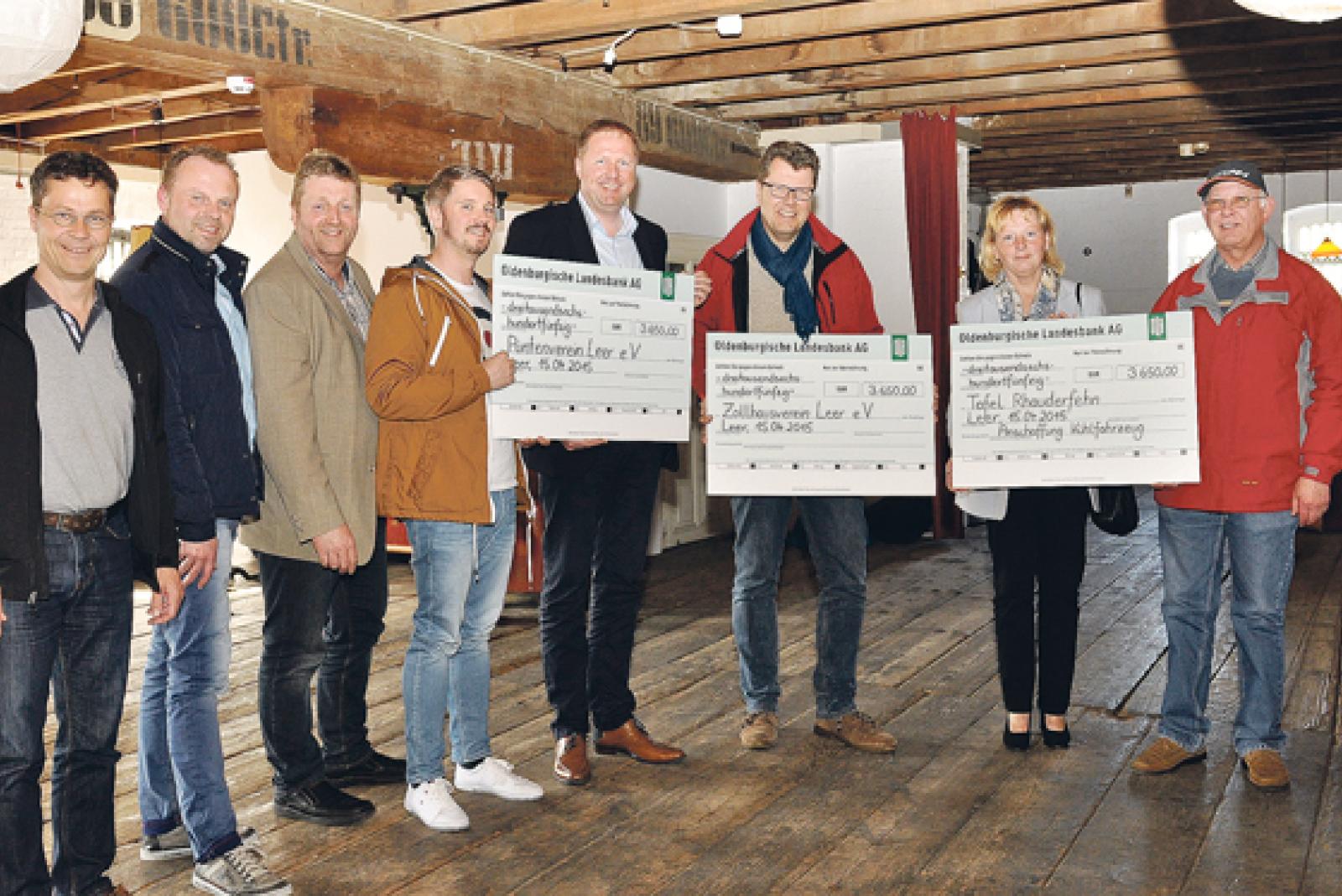 Freude über den warmen Geldsegen: (von links) Ludwig Bornemann, Thomas Ukena und Artur Betten (alle Lions-Club), Ulrich Schmunkamp und Karsten van der Huir (Püntenverein), Eerke-Ivo Bruns (Zollhausverein), Elke Meier und Egon Plaisier (Rhauderfehner Tafel). © Foto: Wolters