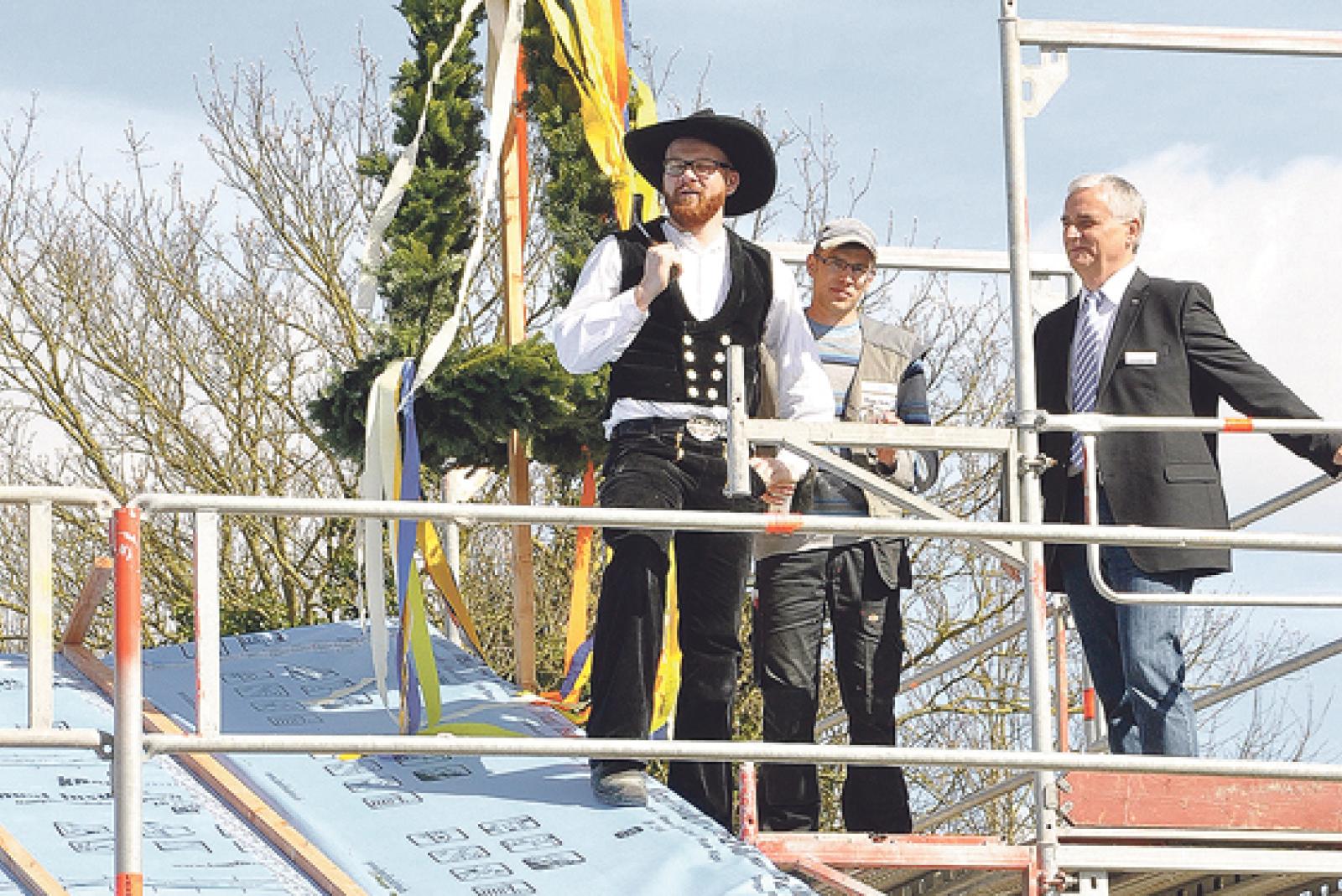 Zimmermannsgeselle Alexander Eilers (links) sagte den Richtspruch für die neue Tagesstätte in Leer auf. © Foto: Wolters