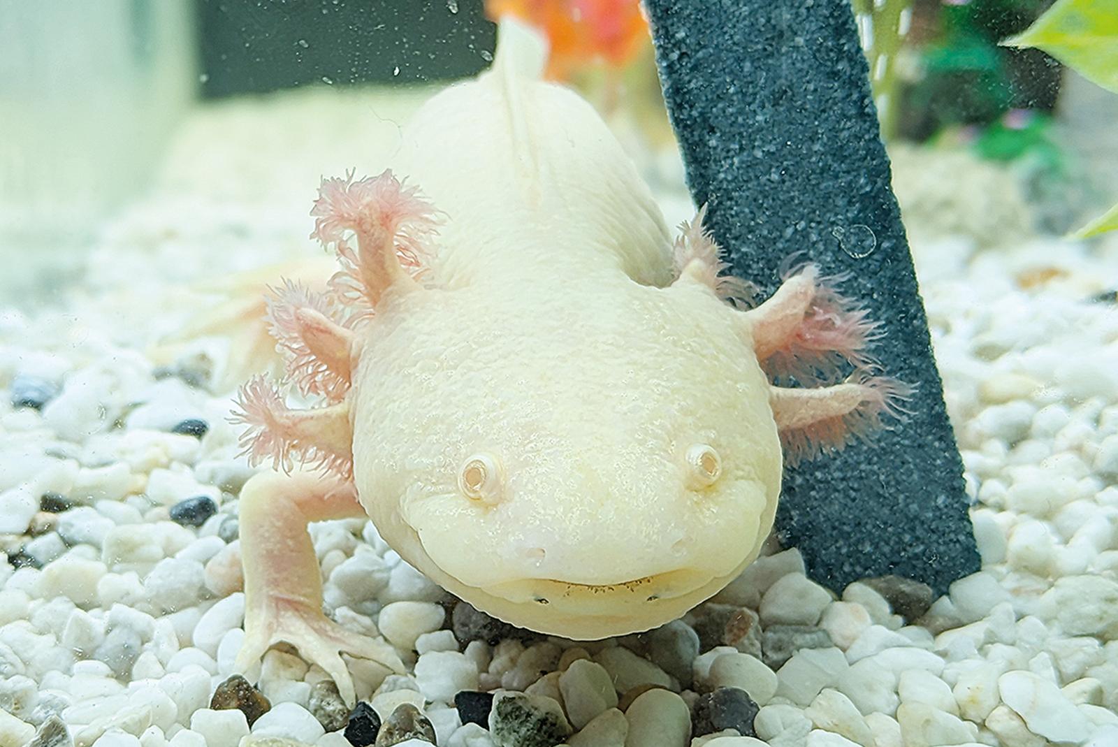 Exotische Kuriosität: Ein Albino-Axolotl aus der Familie der Querzahnmolche blickt durch eine Scheibe der Aquarien, die in einem Kellerraum des UEG-Altbaus stehen. © Foto: Szyska