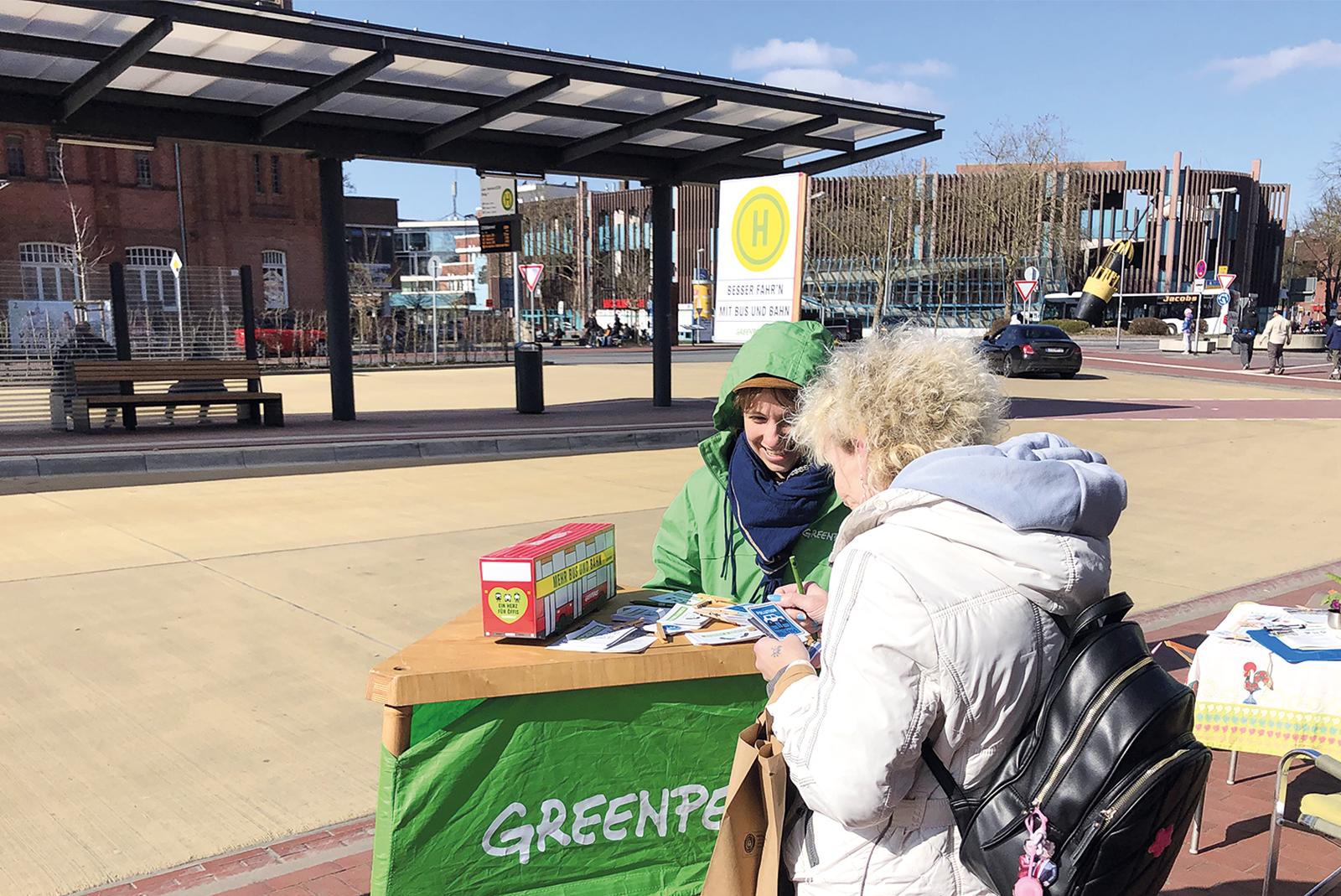 Mit einer »Wunschstelle« machte sich die Greenpeace-Gruppe Leer am Sonnabend für Verbesserungen im Nahverkehr stark. Dabei machten fünf Aktive der Gruppe direkt am Zentralen Omnibusbahnhof in Leer eine Umfrage unter den Reisenden.