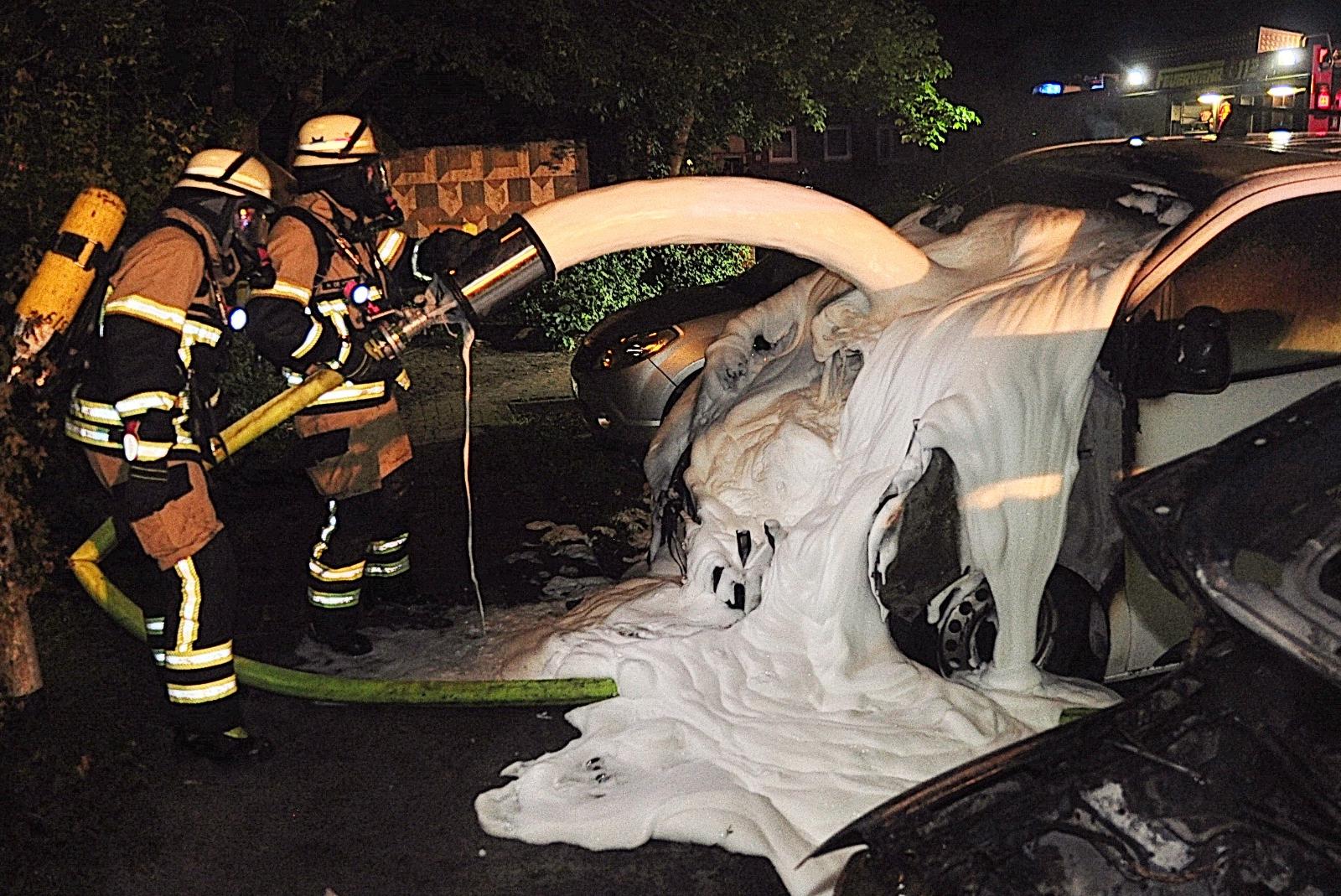 Kaum waren die Einsatzkräfte wieder eingerückt, erfolgte um 1.49 Uhr die nächste Alarmierung – erneut in die Brahmsstraße. Diesmal meldeten Anrufer einen PKW-Brand. "Beim Eintreffen der Feuerwehr stellte sich die Lage dramatischer dar: Vier Fahrzeuge standen unabhängig voneinander zum Teil im Vollbrand. Unverzüglich wurde ein massiver Löschangriff eingeleitet. Durch das schnelle Eingreifen konnte eine Ausbreitung auf weitere parkende Fahrzeuge verhindert werden", schreibt die Feuerwehr.