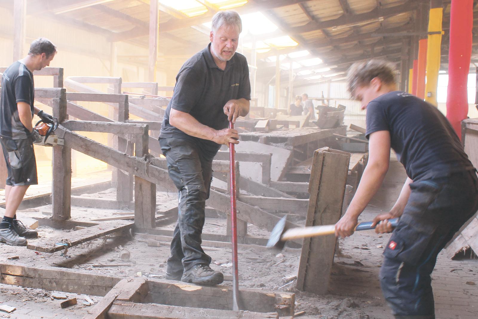 Mit Schwung bei der Arbeit: Größter Brocken war beim Arbeitseinsatz die Demontage der Tribüne.  © Fotos: Berents (2)/privat