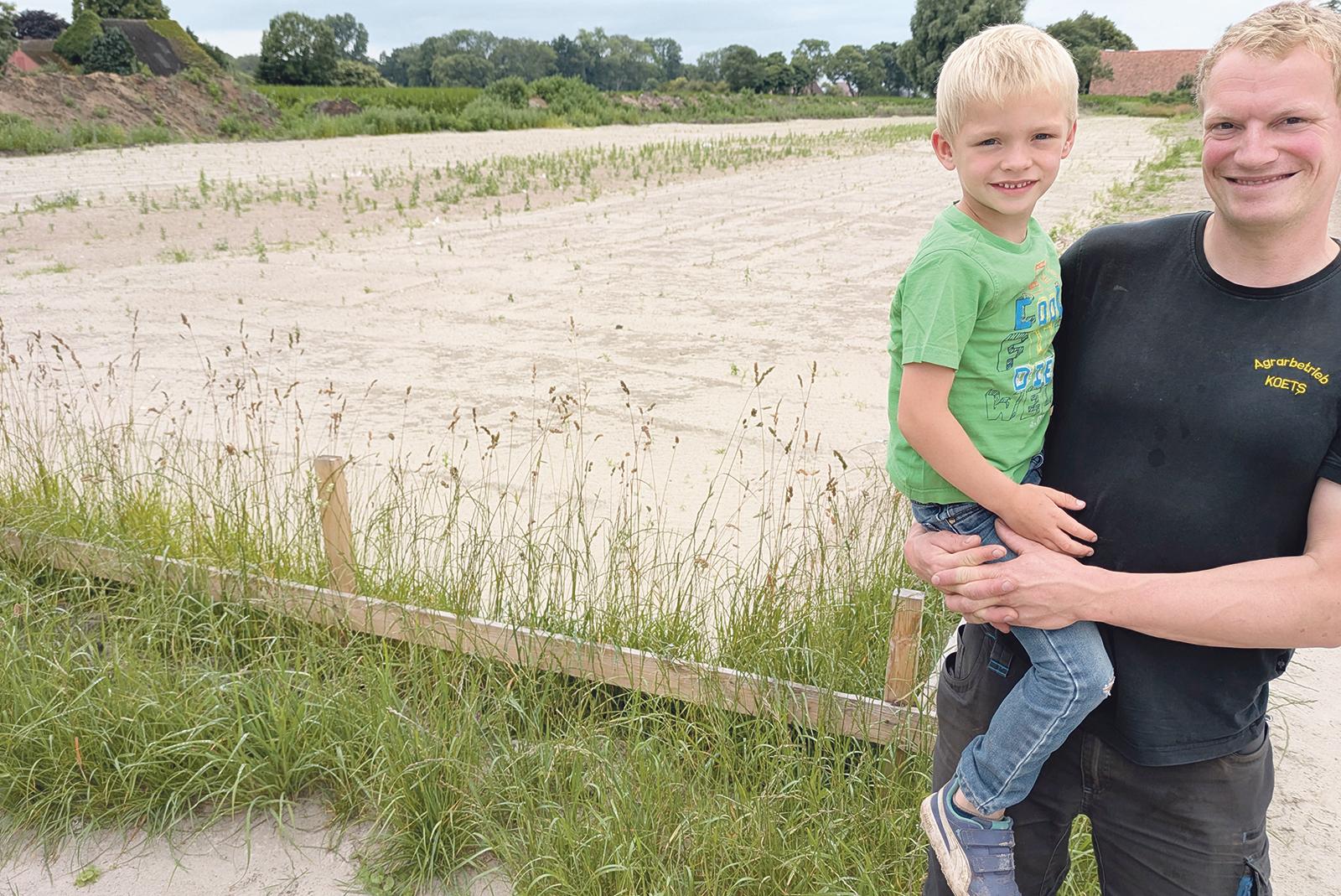 Die Erdarbeiten sind bereits erledigt: Landwirt Hauke Menno Koets mit seinem Sohn Janto vor der rund 3000 Quadratmeter großen Fläche neben dem Kuhstall in Bunderhee, auf der die Anlage zur Mast von Hühnern entstehen soll.  © Foto: Szyska