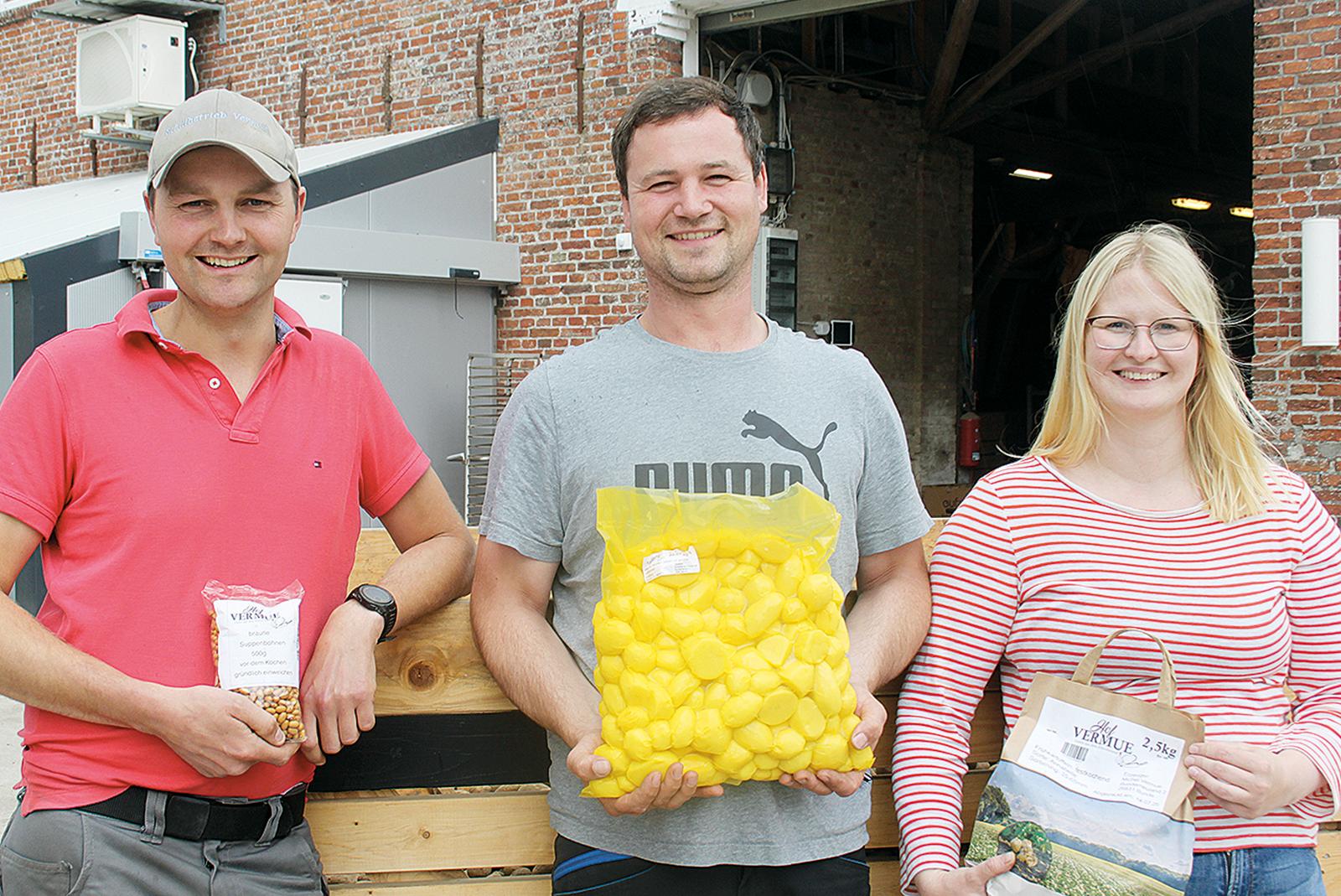 Führen einen gemeinsamen Schälbetrieb und vermarkten auch weitere Lebensmittel direkt: Wilko Sonnenberg (von links), Michel Vermue und seine Frau Tina beliefern viele Supermärkte und Gastronomen aus Ostfriesland und dem nördlichen Emsland mit landwirtschaftlichen Produkten.  © Fotos: Busemann