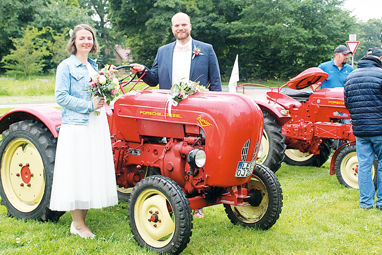 Eine gelungene Überraschung bereitete der Porsche-Diesel-Club Region Weser-Ems am Freitagmittag Annika und Eike in Bunderhee. Die beiden Remelser hatten im Steinhaus standesamtlich geheiratet. Als sie nach der Trauung ins Freie traten wurden sie von einem Spalier historischer Porsche Traktoren empfangen.