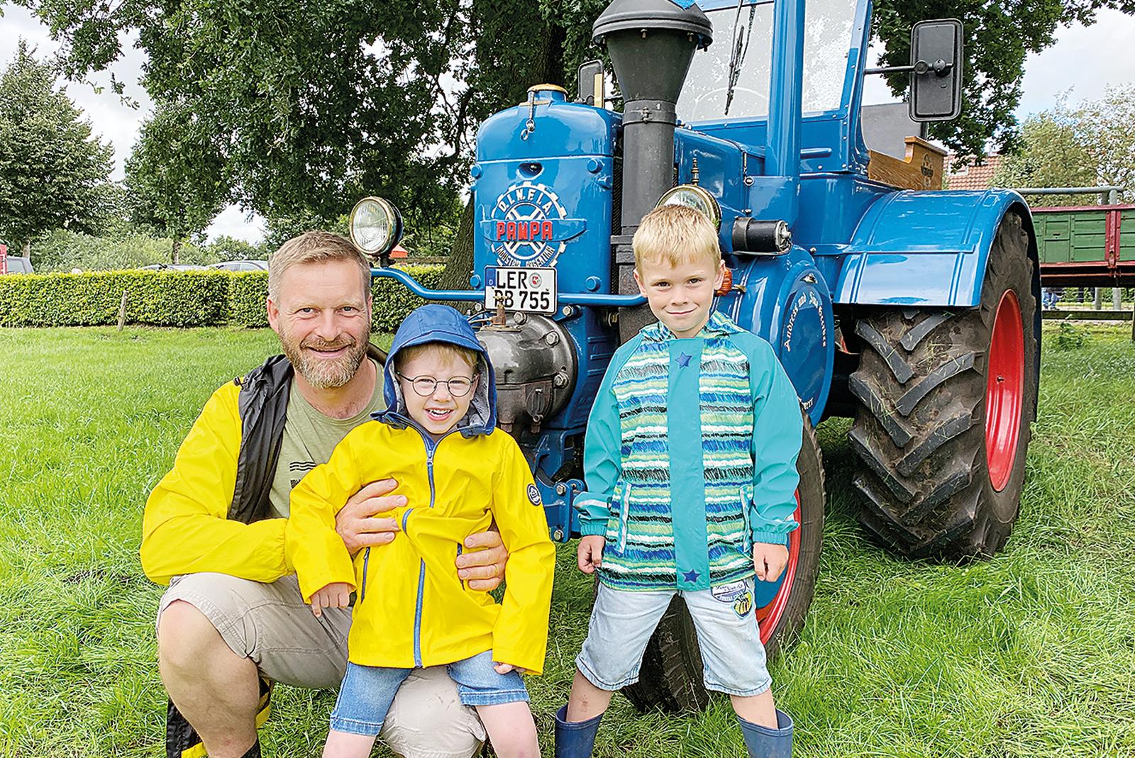 Rainer Wenninga und seine Söhne Lüko und Lukas (rechts) besuchten auch den historischen Trecker T-01 Pampa von 1955.  © Kuper