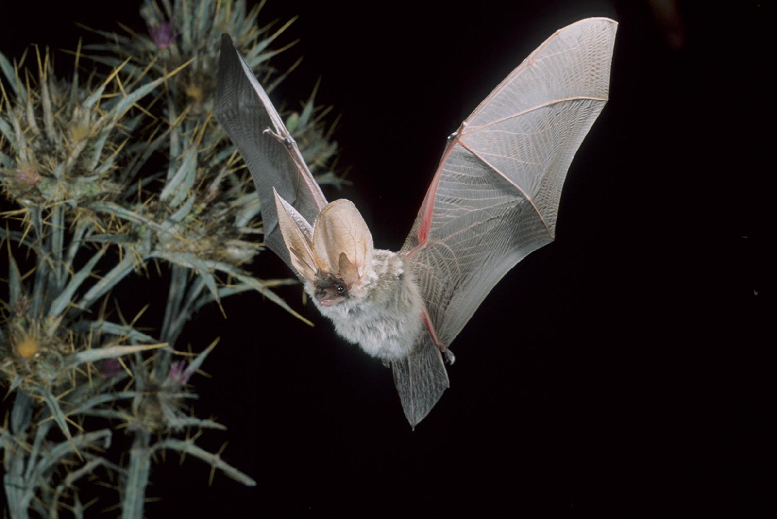 Eine Fledermaus, es handelt sich um ein Graues Langohr, im Flug. © Foto: NABU/Dietmar Nill