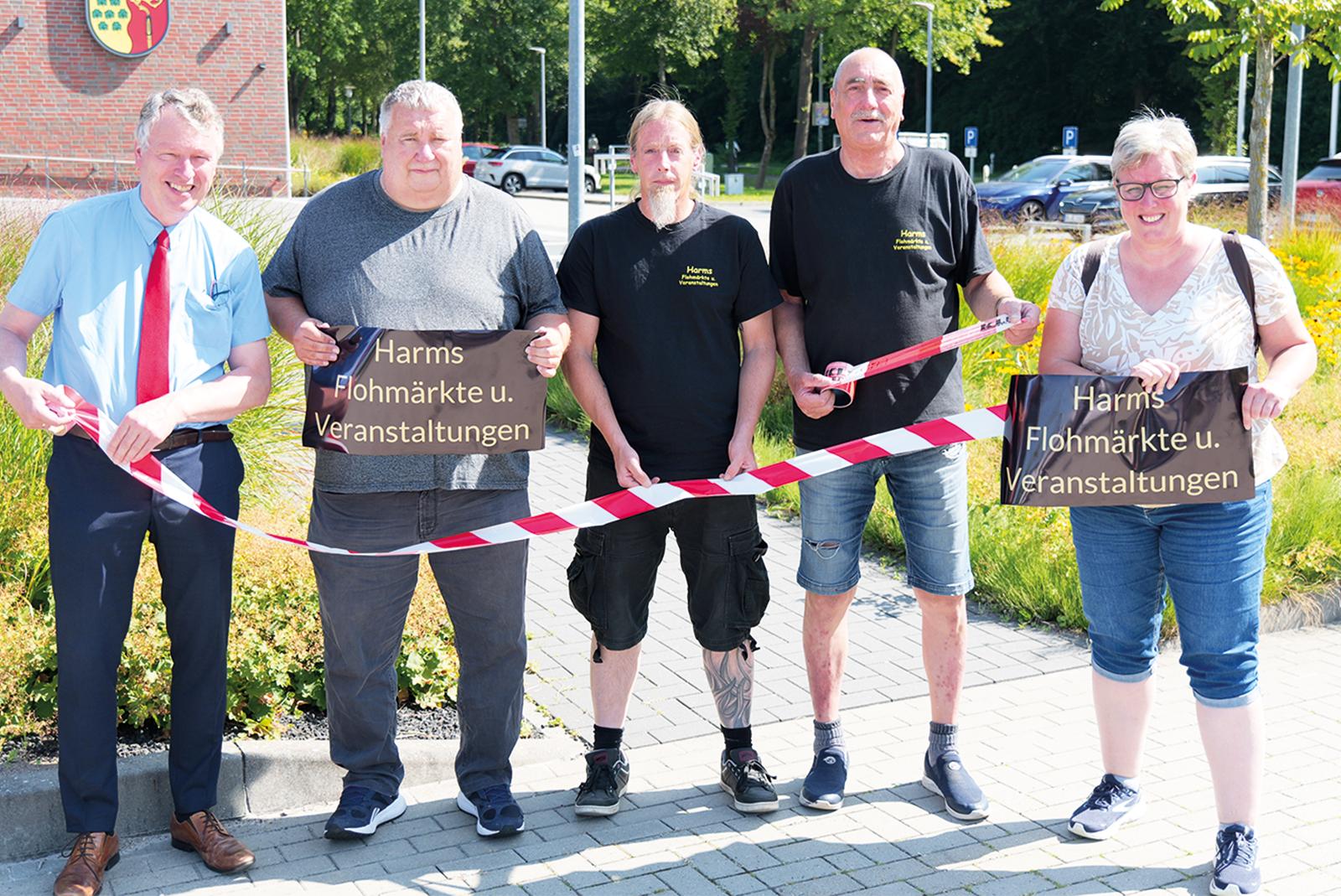 Ihlows Bürgermeister Arno Ulrichs und Simonswoldes Ortsbürgermeister Hinrich Päben mit den Organisatoren Sascha und Horst Harms sowie Sonja Ubben vom örtlichen Dorfverein.  © Foto: Jürgens