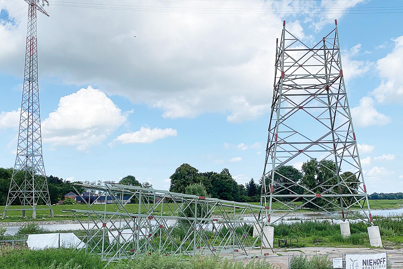 Am Emsufer neben der Seeschleuse in Papenburg warten die Elemente des neuen Hochspannungsmastes auf ihren Aufbau. © Foto: Hanken