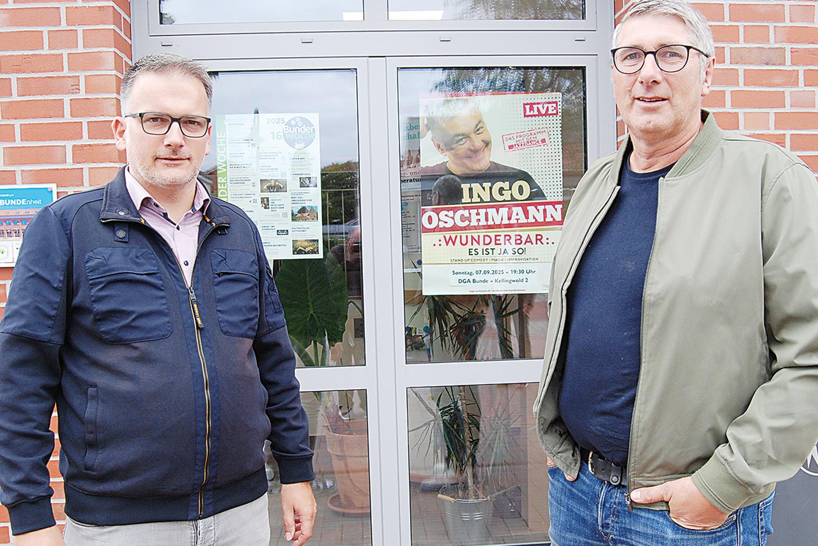 Auch Plakate in den Fenstern des Familienzentrums weisen auf die Bunder Woche hin. Bürgermeister Uwe Sap (links) und Fachbereichsleiter Jörg Siemering stellten gestern noch einmal die Highlights des Programms vor.  © Foto: Hoegen