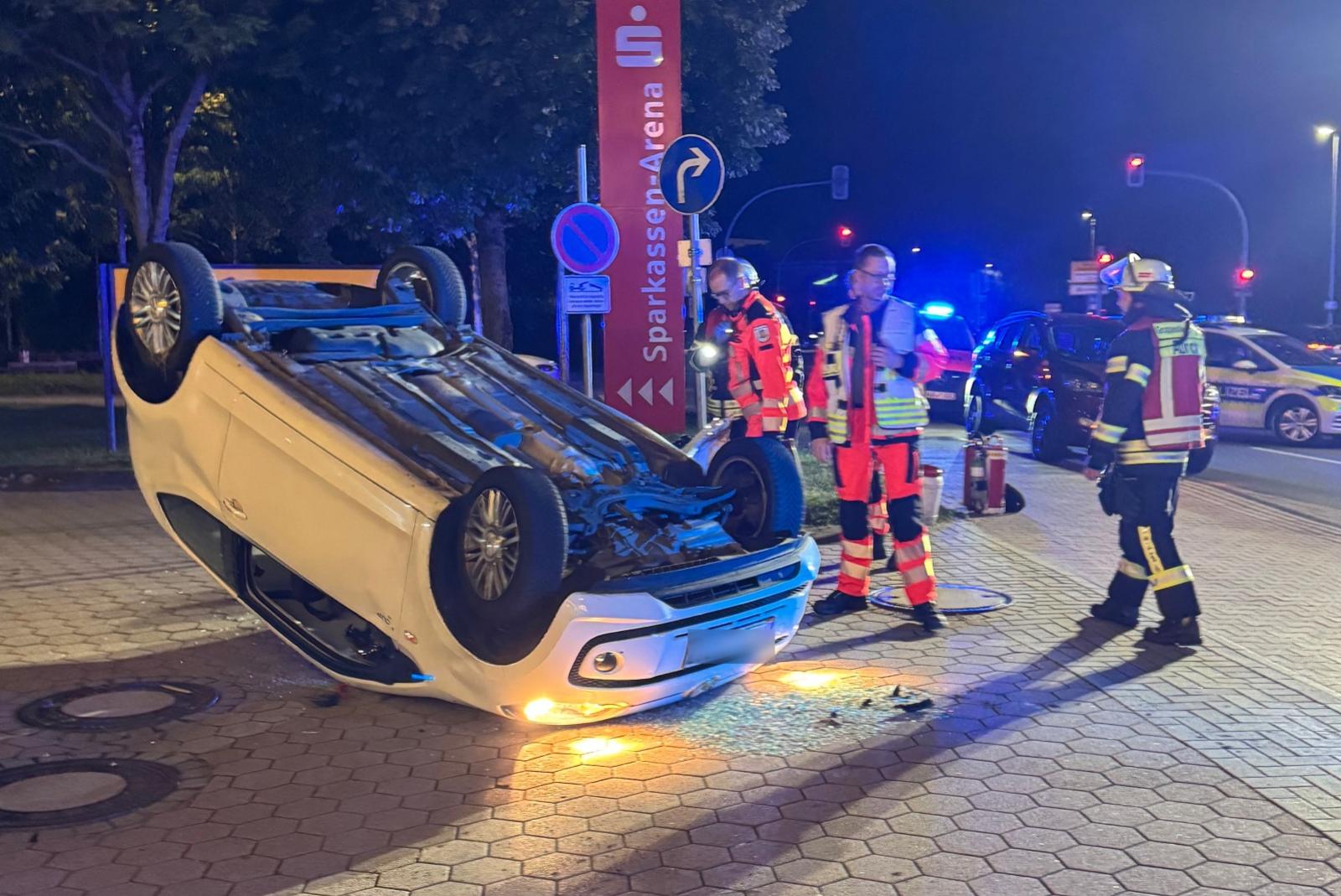 Rettungsdienst, Polizei sowie die Feuerwehren Aurich, Sandhorst und Holtrop sind am späten Samstagabend aufgrund eines schweren Verkehrsunfalls an die Emder Straße ausgerückt. Zwei Fahrzeuge waren auf Höhe eines Tankstellengeländes miteinander kollidiert, wobei sich ein Auto überschlagen hatte und auf dem Dach liegen blieb. Entgegen der ersten Meldung konnten die ersteintreffenden Rettungskräfte feststellen, dass alle drei Unfallbeteiligten bereits selbstständig aus den Fahrzeugen gelangt waren. Sie wurden umgehend durch den Rettungsdienst versorgt, teilt die Feuerwehr mit.