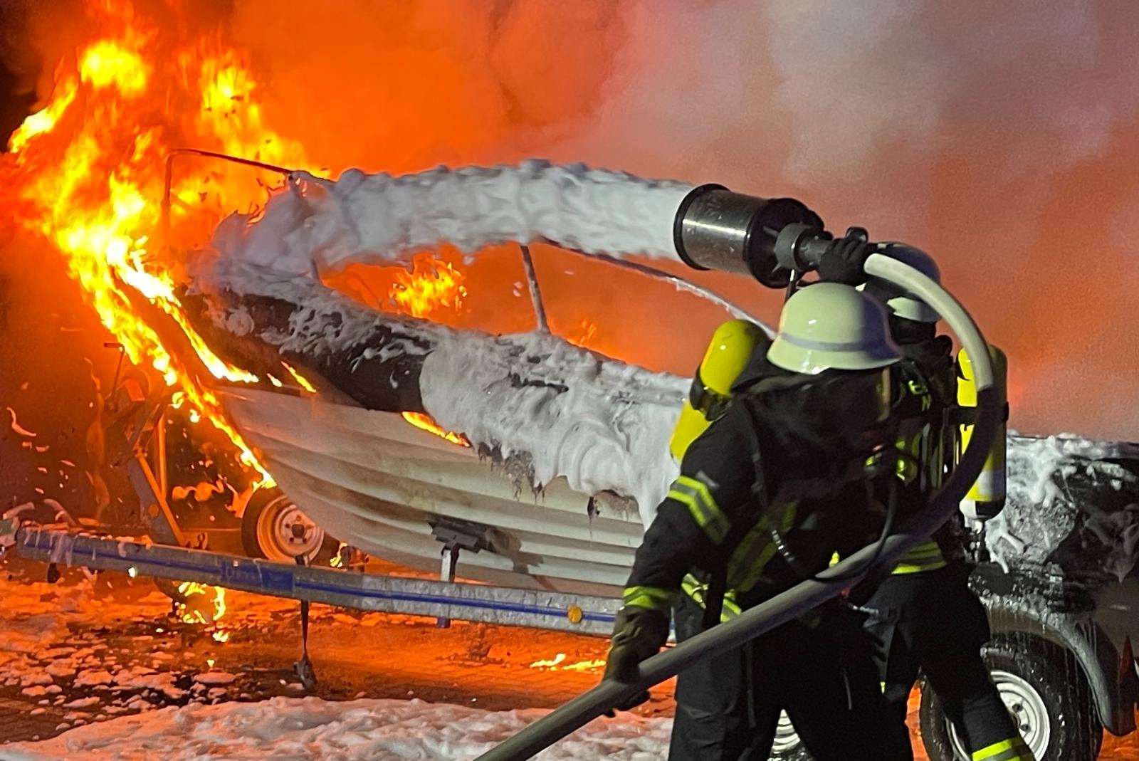 Ein Boot samt Trailer sowie ein Kofferanhänger sind in der Nacht zu Montag in Norden ein Raub der Flammen geworden. Gegen 2.30 Uhr war der Brand auf einem Parkplatz zwischen den Straßen Im Horst und Glückauf gemeldet worden, meldet die Feuerwehr. Zu diesem Zeitpunkt standen bereits alle drei Fahrzeuge komplett in Flammen. Der anrückenden Freiwilligen Feuerwehr Norden wurde der Weg zur Einsatzstelle in der Innenstadt bereits von weitem durch einen hellen Feuerschein und eine starke Rauchentwicklung gewiesen.