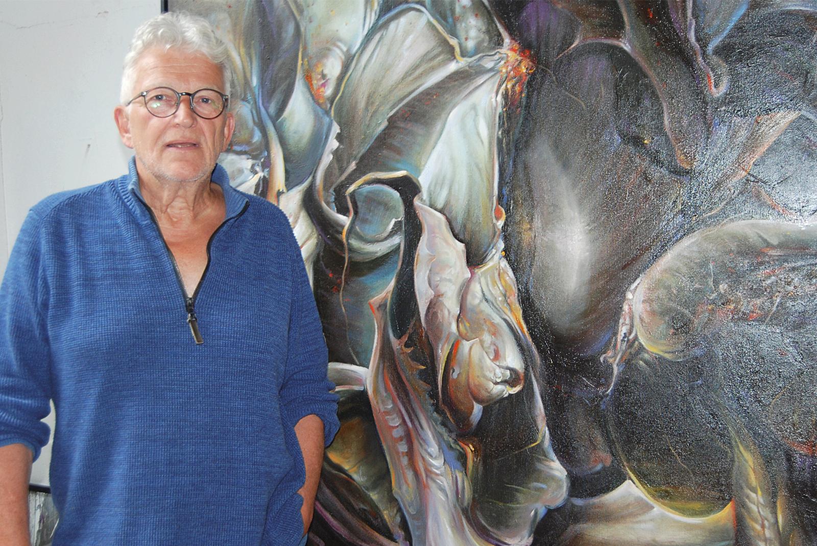 Treffpunkt Atelier: Ulrich Schnelle vor einem seiner abstrakten Gemälde. © Foto: Hoegen