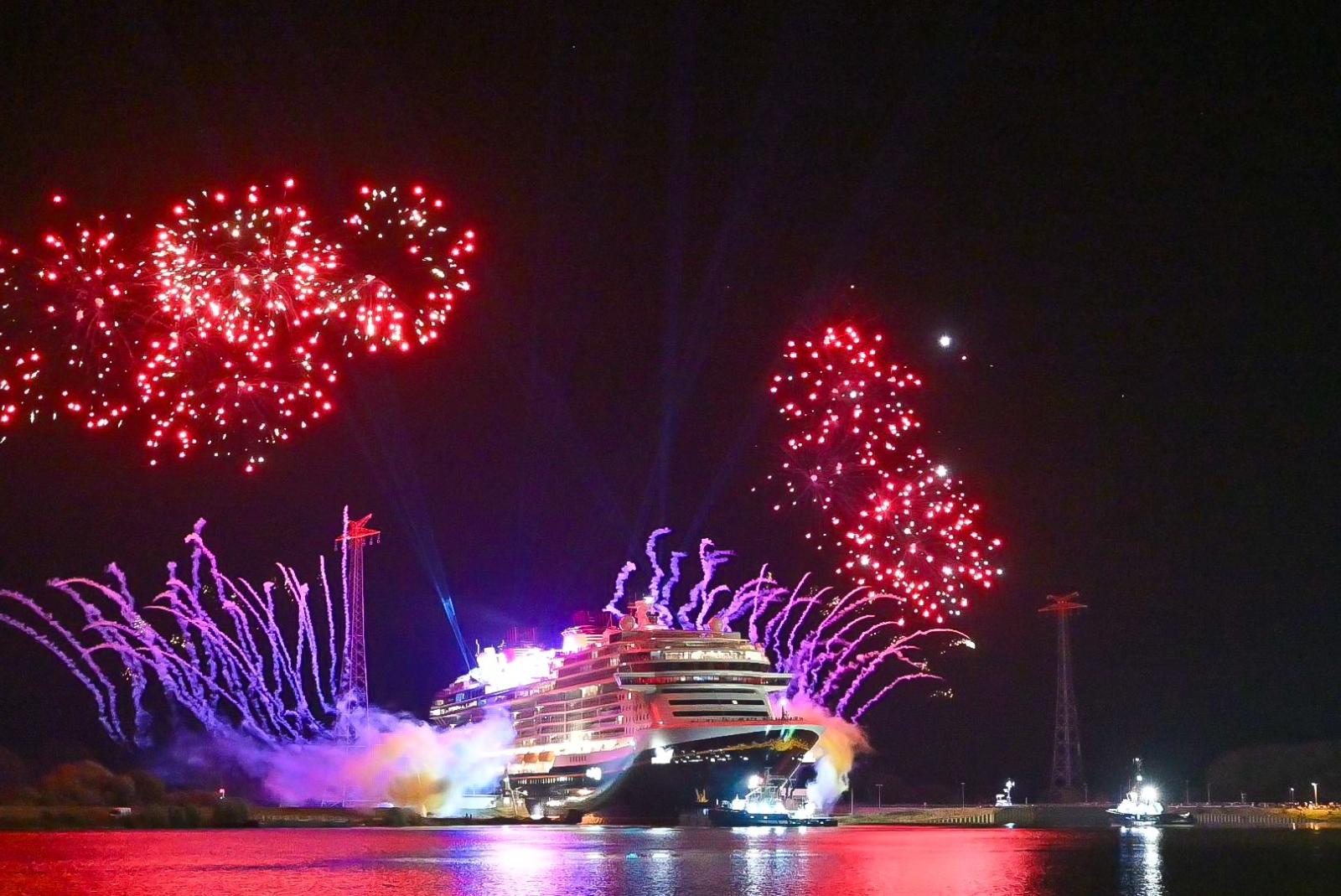 Die Ems-Passage des neuen Kreuzfahrtschiffes begann um Mitternacht mit einem großen Feuerwerk. © Foto: Bruins