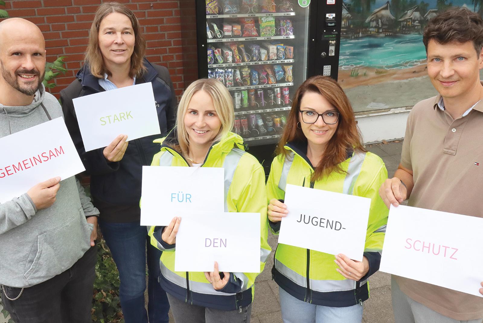 Dirk Emmerich (Oldenburg), Alexandra Pille (Cloppenburg), Sabine Frickhof, Alena Schulz (beide Ammerland), Timo Rump (Friesland, von links) und Jasmin Sanders (Leer, nicht im Bild) sehen Verkaufsautomaten kritisch. © Foto: Landkreis Leer