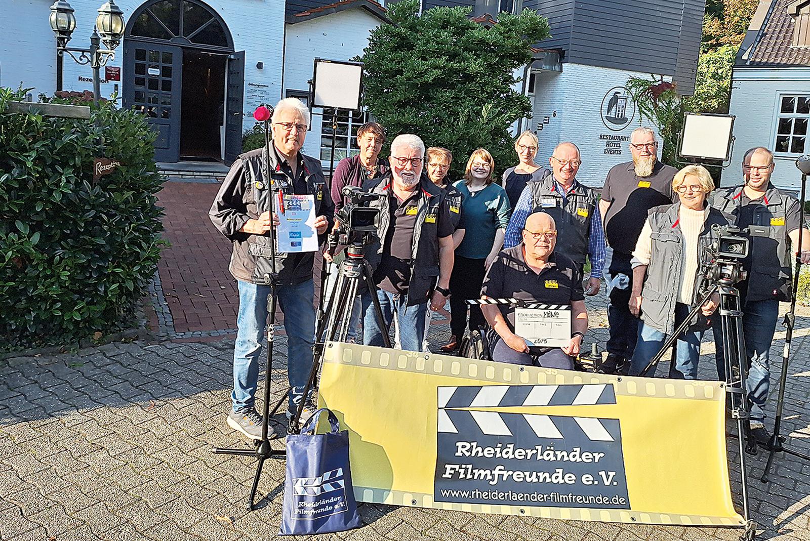 Im »Reiherhorst« in Halte drehten die »Rheiderländer Filmfreunde« Szenen für den neuen Streifen. Von links: Friederich Sap, Anja Oltrop, Gerhard M. Willms, Hanne Poelmann, Andrea Siemons, Uta Loesing, Alfred Poelmann (sitzend), Metto Lübbers, Timo Winterboer, Erika Windeler und Kim Uwe Siemons.  © Foto: privat