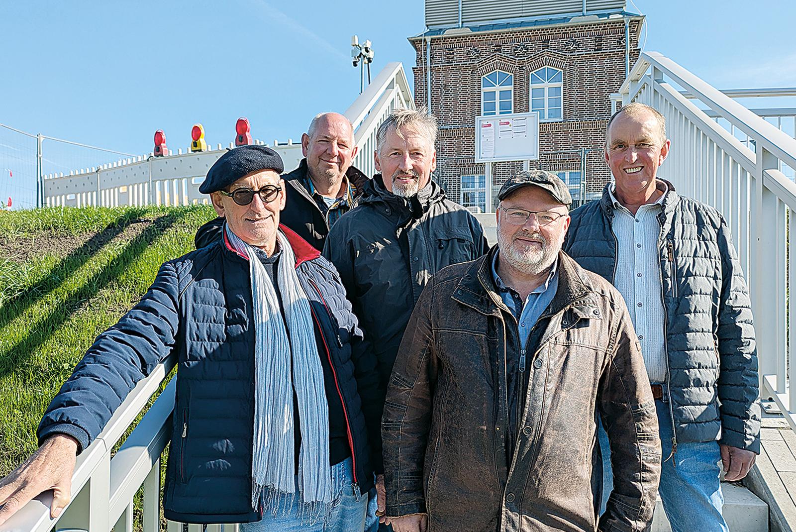 Bei der Herbst-Deichschau sahen sich (von links) Oberdeichrichter Meint Hensmann, Deichrichter Detert Gruis, Wasserwirtschaftsamtsleiter Johann Eckhoff vom Landkreis Leer, Jann-Ewald Wienekamp vom Wasserstraßen- und Schifffahrtsamt und Deichrichter Reinhard Schüür auch die neue Rampe für Radfahrer und Fußgänger an der Friesenbrücke in Weener an. © Foto: Szyska