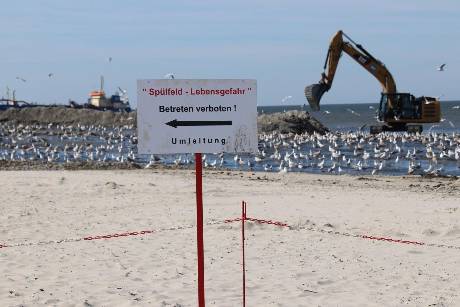 Blick auf eine Sandaufspülung am Weststrand der Insel Norderney. Kurz vor dem Beginn der Sturmflutsaison hat der Küstenschutz in Niedersachsen letzte Baustellen abgeschlossen. Die Sturmflutsaison dauert in der Regel von Oktober bis März. © Foto: dpa/Bartels