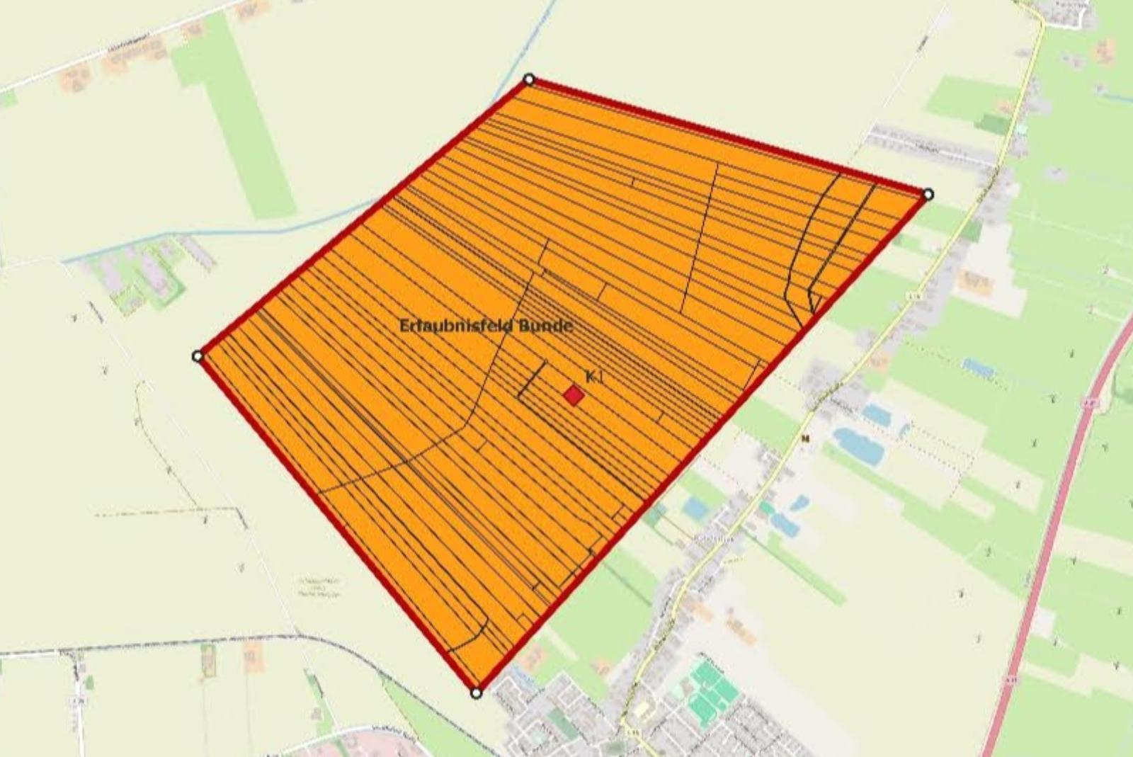Die rote Markierung innerhalb des Erlaubnisfeldes Bunde kennzeichnet die geplante Erkundungsbohrung K1. © Grafik: Nobian