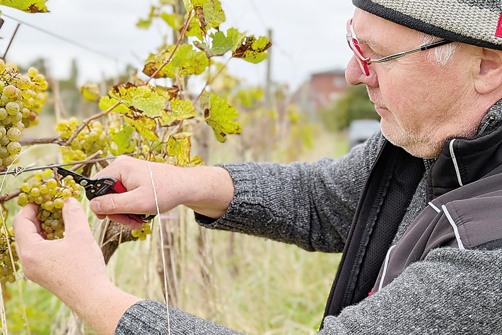 Weinlese in den Rebstöcken in Ditzumerverlaat: Winzer Harbert Poppens, der in Sichtweite auf einem Bauernhof in Heinitzpolder seine Kindheit und Jugend verbrachte, erntete dieser Tage die Trauben der weißen Sorte »Helios«.  © Foto: Szyska