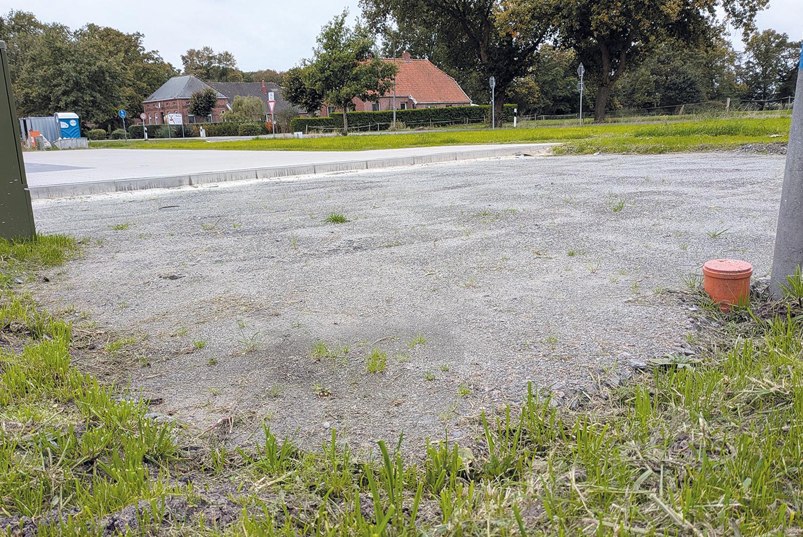 Die Zufahrt mit den Pkw-Stellplätzen im neuen Wohnbaugebiet in Wymeer ist schon gepflastert, in Kürze wird hier die »cBox« im Stil eines Containerladens aufgestellt. © Foto: Szyska