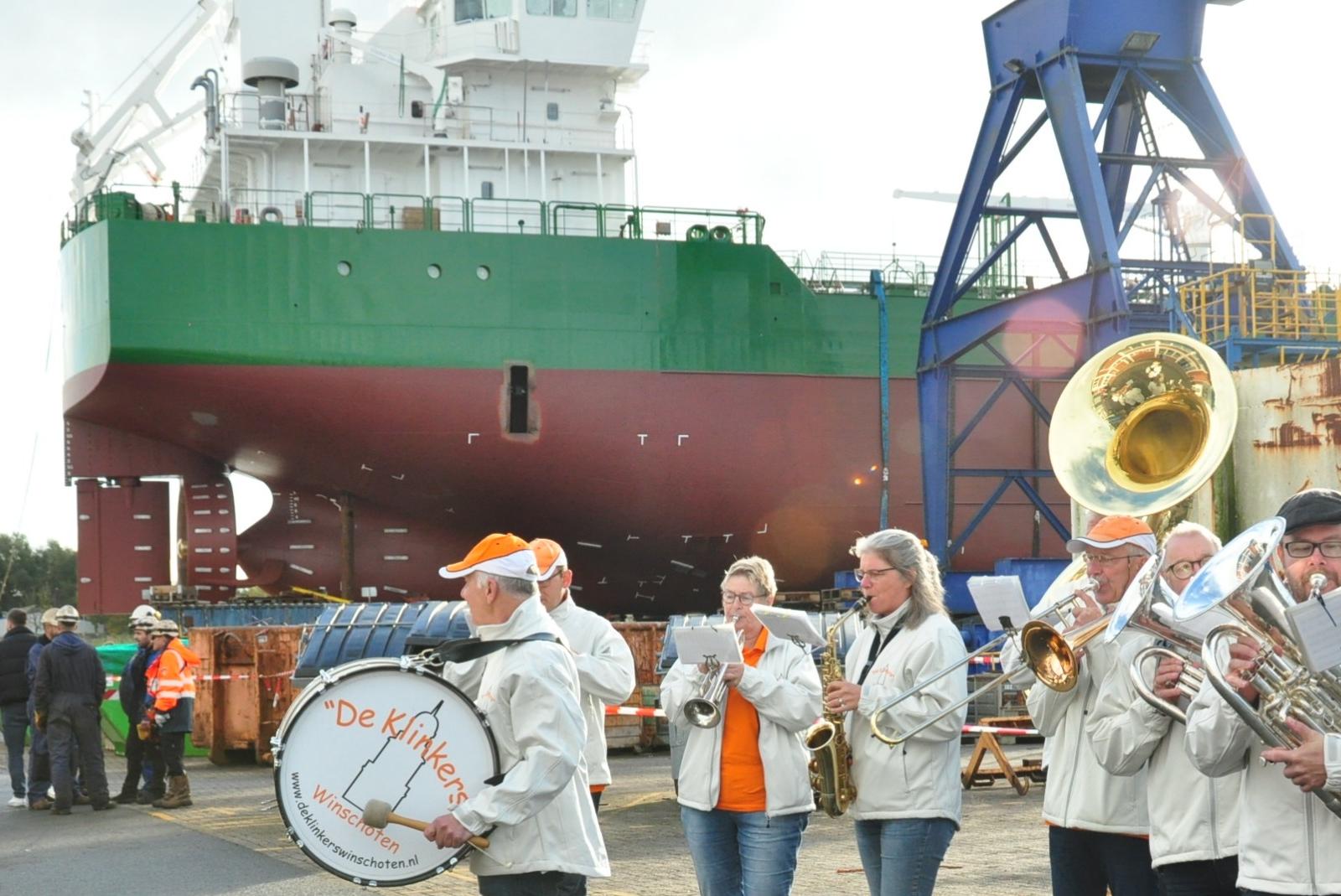 Die Blaskapelle "De Klinkers" aus Winschoten sorgte beim Stapellauf für musikalische Begleitung. © Foto: Wolters