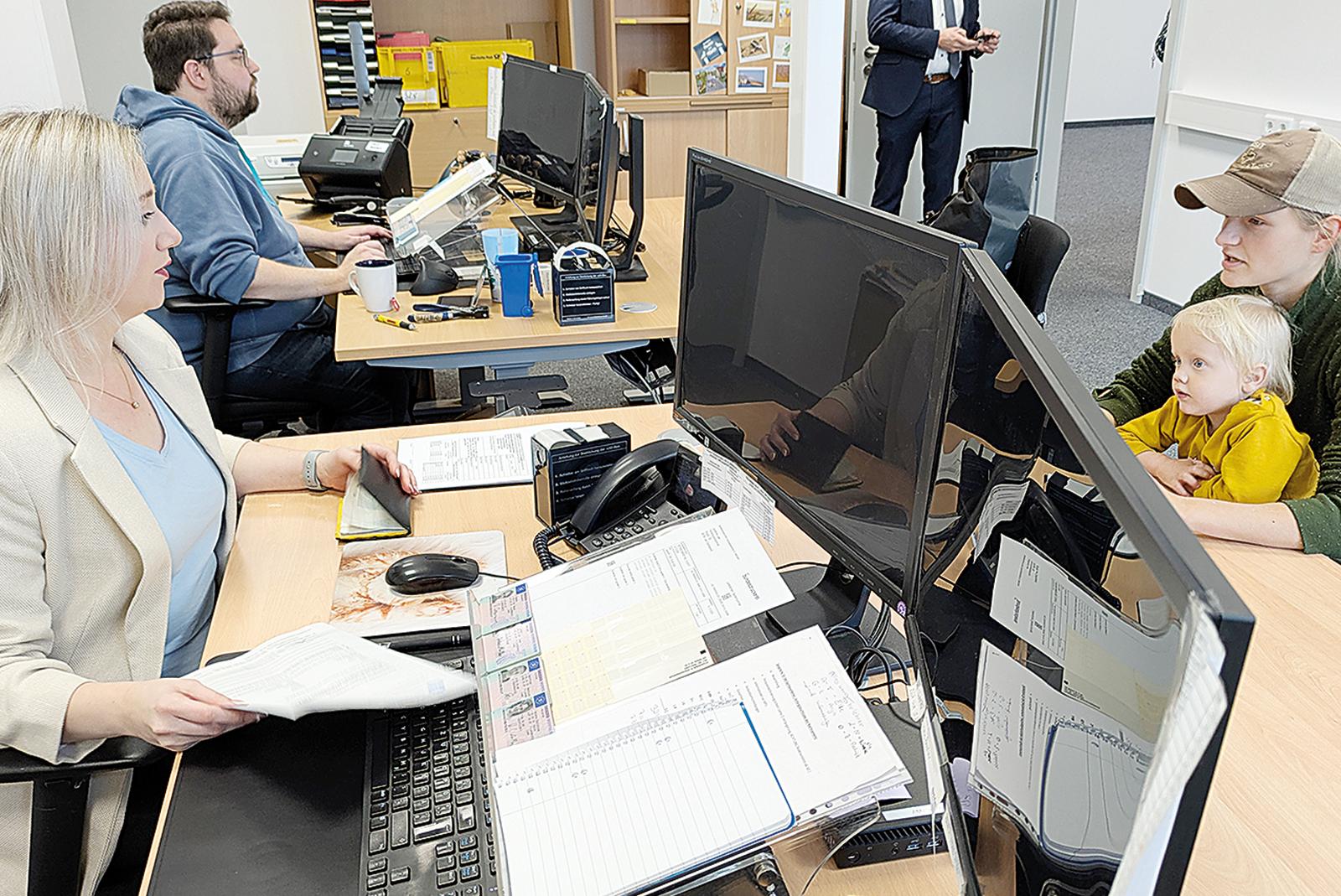 Ramona Vater aus Rhauderfehn gehörte heute Morgen zusammen mit ihrem zweijährigen Sohn Lukas zu den ersten Kundinnen von Sachbearbeiterin Nadine Heuer am neuen Standort der Kreis-Führerscheinstelle. Im Hintergrund: Sachbearbeiter Jan Rieken.  © Foto: Szyska
