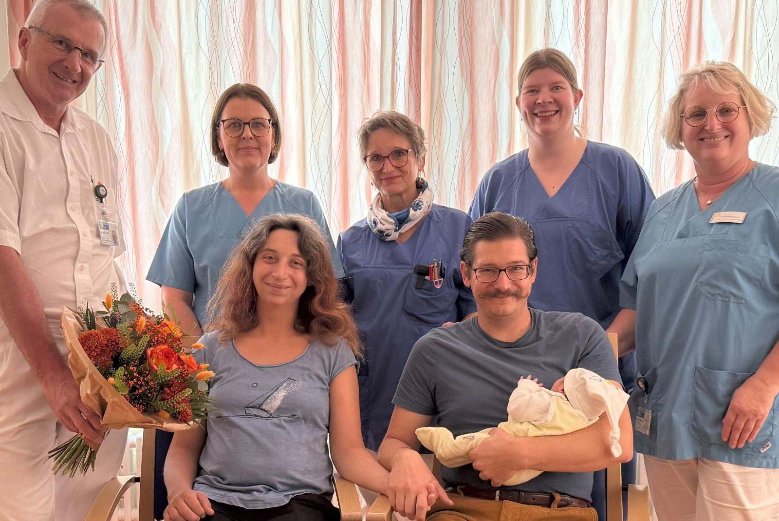 Freuen sich über das 1000. Baby (von links): Dr. med. Jacek Skubis (Chefarzt der Klinik für Gynäkologie und Geburtshilfe), Anja Blüge (Sekretariat Gynäkologie und Geburtshilfe), Angelika Hartmann (Hebamme), Anna Böke-Appel (leitende Hebamme), Gitta Möhlmann-Cramer (Teamleitung Station B1) mit Barbara und Daniel Mulley und ihrer Tochter Angeline. © Foto: Klinikum Leer