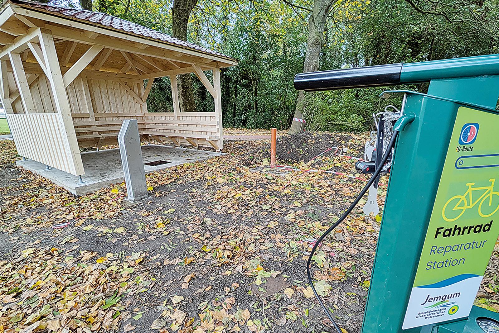An der Ecke zur Deichstraße in Jemgum wurden neben einem Trinkwasserbrunnen auch eine Schutzhütte und eine Service-Station mit Reparatur-Werkzeug aufgebaut.  © Foto: Szyska