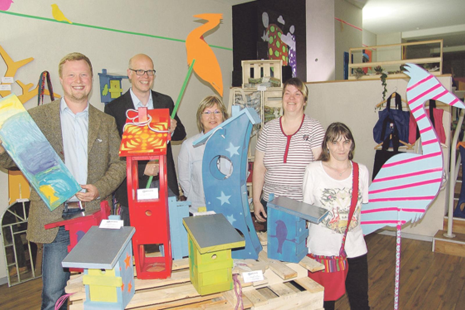 Setzen sich für den neuen Laden der Lebenshilfe in der Leeraner Fußgängerzone ein (von links): Marten Paul, Thomas Winsenborg, Meike Bohlen, Gertrud Heimeir und Kerstin Strattmann. Im Laden werden Eigenprodukte verkauft, die in den Werkstätten der Lebenshilfe gefertigt worden sind.  © Foto: Boelmann