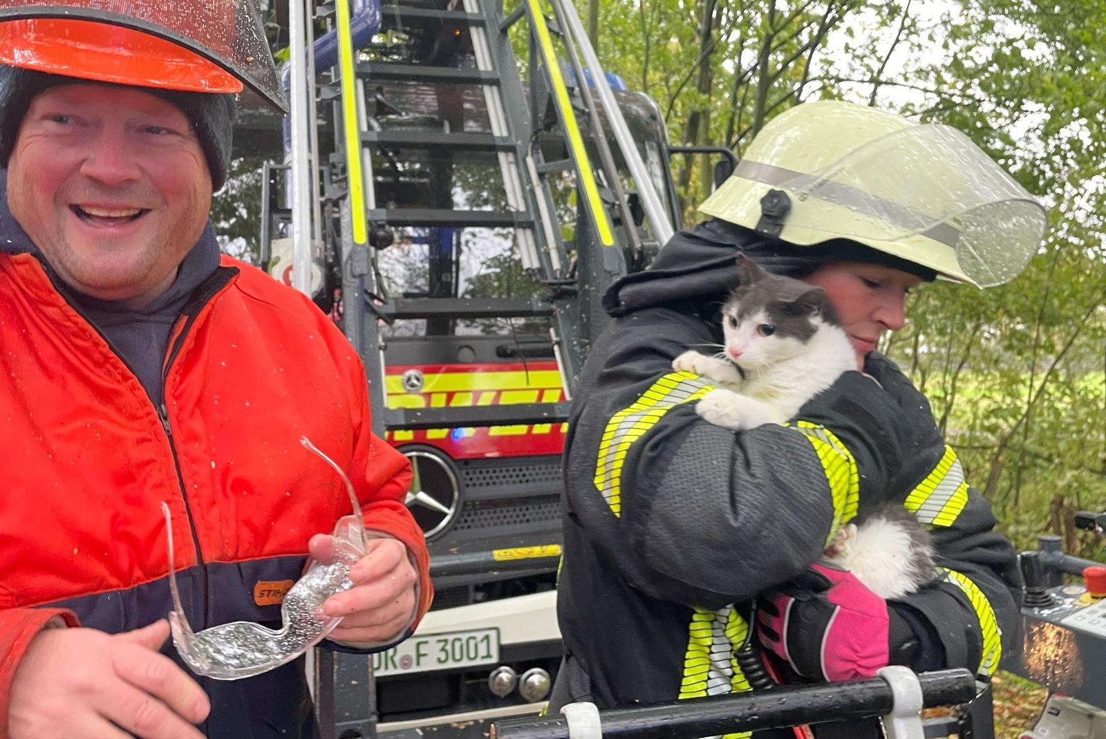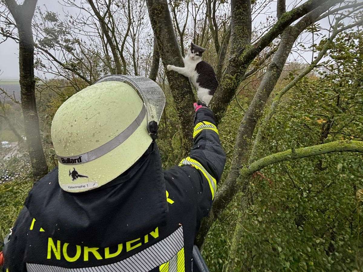 Fünf Tage hat eine Katze bei teilweisem Sturm und Regen in 16 Metern Höhe auf einem Baum im Norder Ortsteil Leybuchtpolder verbracht. Da „Queeny“ nicht von alleine herunterkam, musste letzten Endes am Sonnabend die Freiwillige Feuerwehr Norden zur Rettung mit der Drehleiter anrücken. Bevor es zum Happy End kam, kam auch eine Motorsäge zum Einsatz, heißt es in einer Pressemitteilung der Feuerwehr Norden.