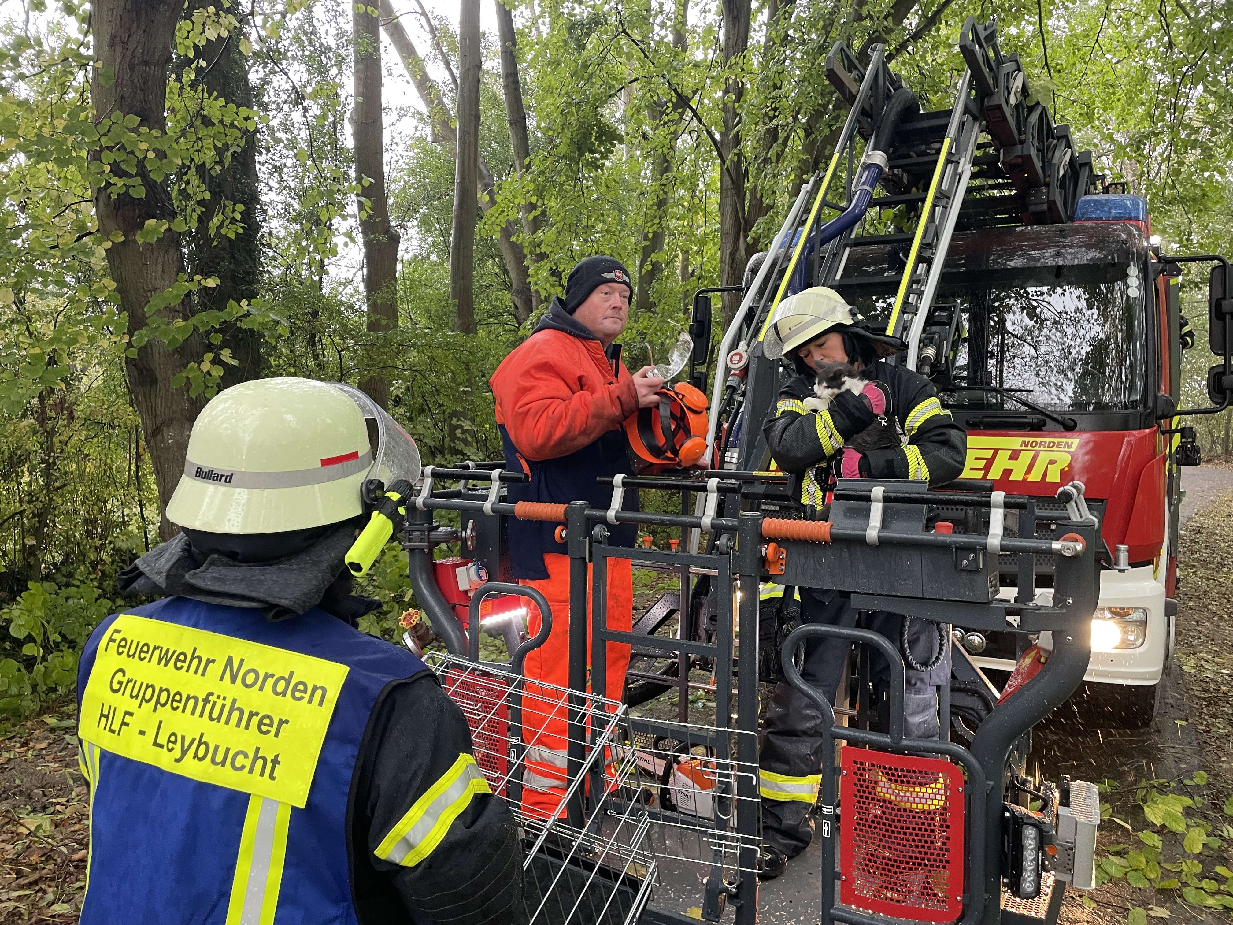 Wie vereinbart, kontaktierten die Besitzer die Norder Feuerwehr erneut. Da der Wind nachgelassen hatte, rückte sie nun mit ihrer Drehleiter und dem Löschfahrzeug vom Standort Leybuchtpolder an. Doch bevor die Tierrettung erfolgen konnte, mussten die Einsatzkräfte sich den Weg zu "Queeny" erst mit einer Kettensäge freischneiden. Zahlreiche Äste versperrten nämlich den Weg. Nach rund einer Stunde Arbeit und zwei kräftigen Regenschauern konnten zwei Feuerwehrleute im Drehleiterkorb Queeny endlich erreichen. Die Katze versuchte noch kurz vor ihnen nach oben zu flüchten, aber die Einsicht sich nun doch retten zu lassen, kam dann schnell. Die Katze ließ sich zu Freude aller Beteiligten schließlich fangen.