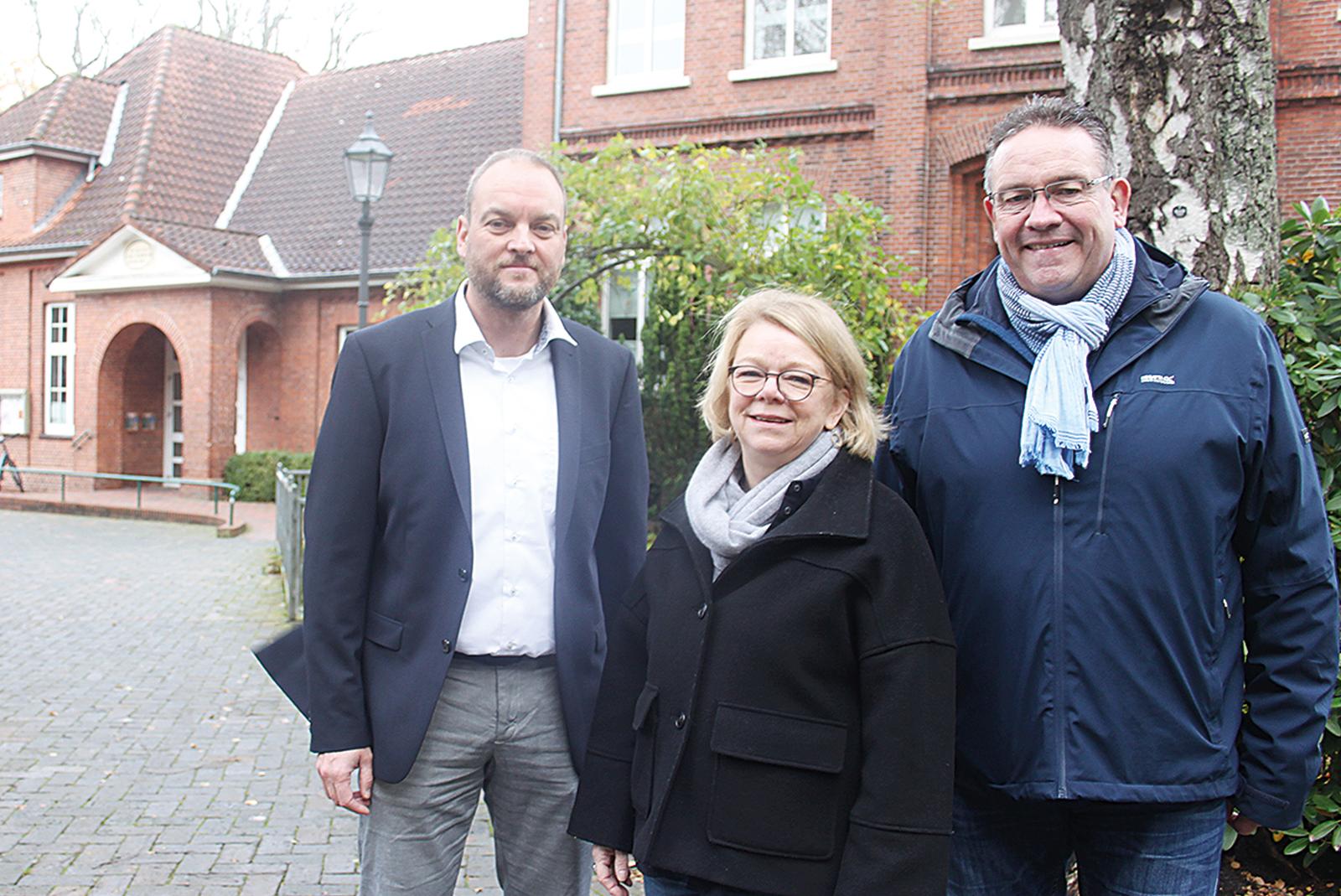 Das Gemeindehaus der evangelisch-reformierten Kirchengemeinde Weener (hinten links) und das historische Pfarrhaus (rechts) werden zu einem großen und zeitgemäßen Gemeindezentrum verschmelzen. Architekt Karsten Woltermann (vorne links), Traute Schilling von der evangelischen Landeskirche und Detlef Troff vom Kirchenvorstand stellten die Pläne vor.  © Foto: Busemann