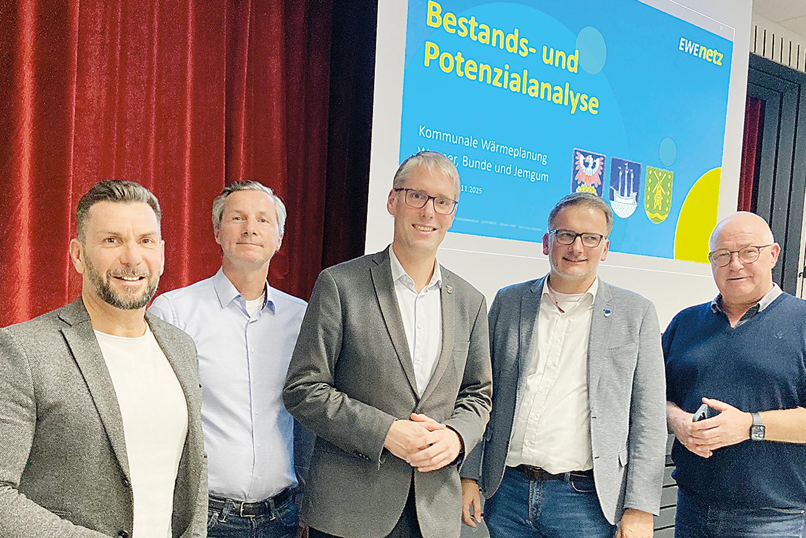 EWE Netz-Kommunalbetreuer Gerrit Pruss (von links) und Projektleiter Alexander Grote stellten die bisherigen Ergebnisse der Kommunalen Wärmeplanung für das Rheiderland in der Aula der Grundschule Stapelmoor vor. Auch die Bürgermeister Heiko Abbas (Weener), Uwe Sap (Bunde) und Hans-Peter Heikens (Jemgum) standen den Bürgern Rede und Antwort.  © Foto: Busemann