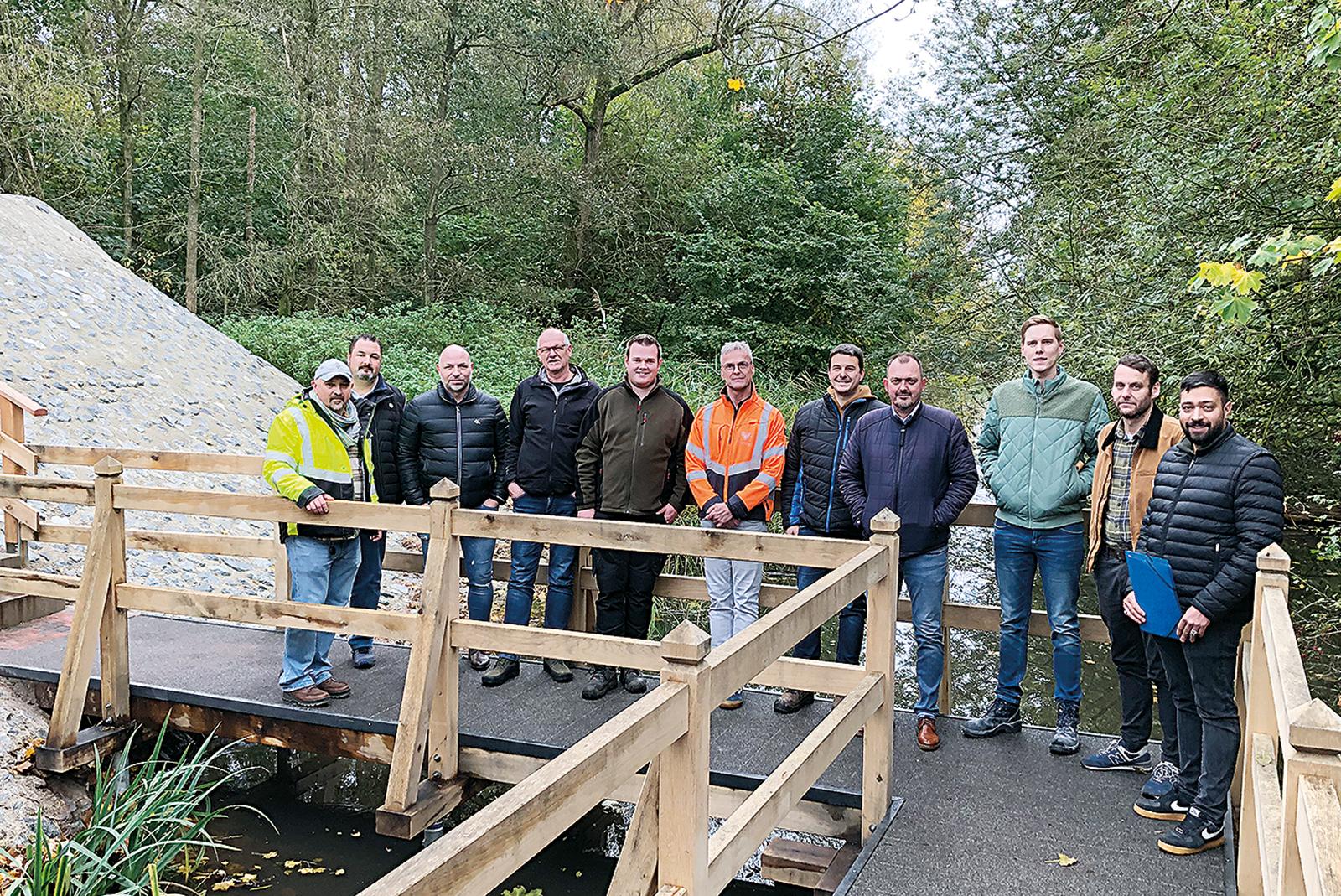Bei der Abnahme der Sielbauwerke (von links): Eduard Stoll, Marcus Luikenga, Michael Pruin (alle Gemeinde Westoverledingen), Hans-Peter und Sören Bleeker (Garten- und Landschaftsbau Bleeker), Harm Eiting (Tiesler Hoch- und Tiefbau), Andreas Gäken (Quappen Holzbau), Marco Smid (Fachbereichsleiter Bauen und Planen), Mark Wildemann (ArL Aurich), Jan Fligg (Gemeinde) und Lokman Ktaich (Ingenieurbüro Grote). © Foto: Gemeinde Westoverledingen