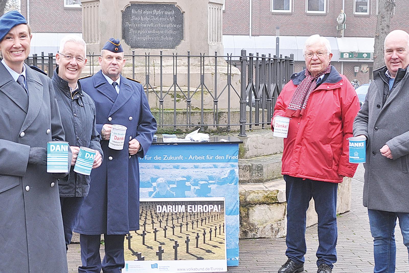 Im Bild von links: Oberstarzt Dr. Mascha–Christine Groß, Landrat Mattias Groote als Kreisvorsitzender des Volksbundes, Ober­stabsfeldwebel Pascal Burger, Volksbund-Kreisgeschäftsführer Folkert Laupichler und Bürgermeister Claus-Peter Horst.  © Foto: Wolters