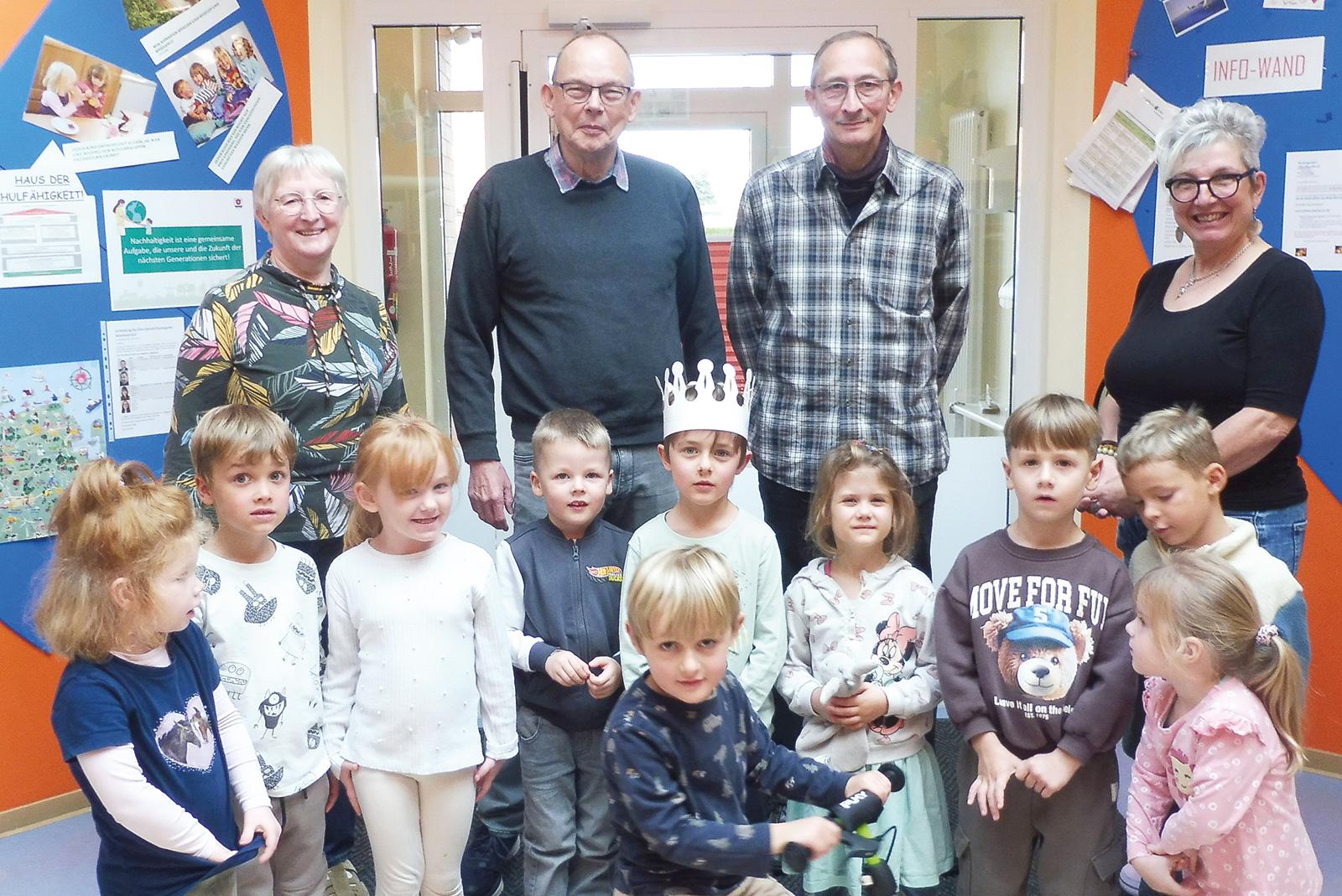 Die Vertreter der ADFC-Ortsgruppe Marianne Ulrichs (hinten, von links) und Gernot Knipper übergaben mit Bernd Wilkens die Räder an Leiterin Anke Noack und mehrere Kinder des Kindergartens »Abenteuerland«.  © Foto: Gemeinde Westoverledingen