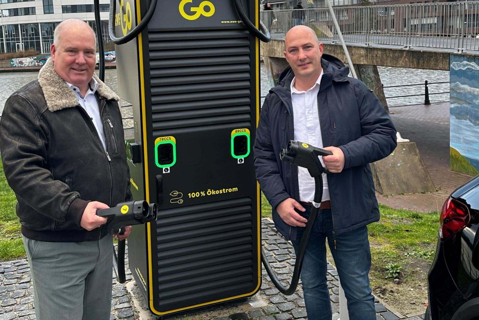 Präsentieren die Ladesäule an der Kupenwarf in Leer: Bürgermeister Claus-Peter Horst und Stefan Becker von der EWE Go GmbH. © Stadt Leer