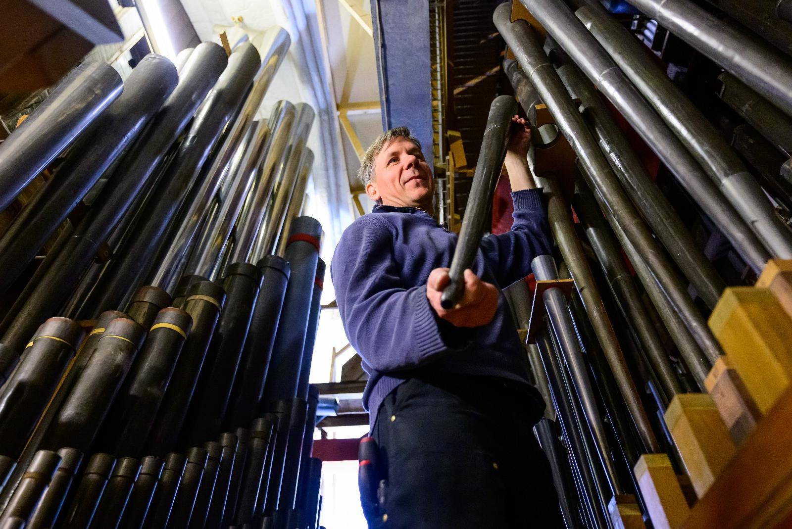 Pfeifenmacher Torsten Wettstein von der Leeraner Orgelbauwerkstatt Ahrend demontiert in der St.-Johannis-Kirche Orgelpfeifen, die zum Teil aus dem Jahr 1553 stammen. © Foto: Schulze (dpa)