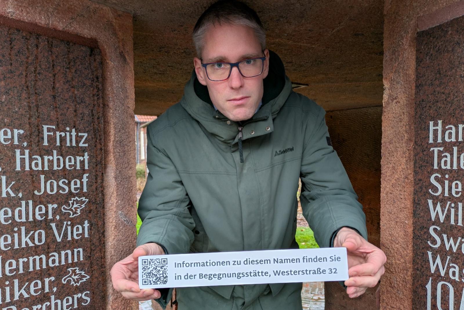 Auf dem Ehrenmal für die Opfer von Krieg und Vertreibung an der Neuen Straße in Weener wurde im Beisein von Bürgermeister Heiko Abbas eine Kunststoffplatte über den Namen des NS-Kriegsverbrechers Jakobus Onnen geklebt. © Foto: Szyska