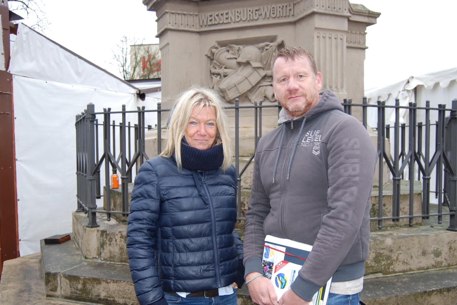 Mechthild Tammena und Michael Kröger vor dem Kriegerdenkmal in der Fußgängerzone. Hier findet am Montag auf dem Denkmalplatz auch die Mahnwache für Frieden und Solidarität mit der Ukraine statt. © Hoegen