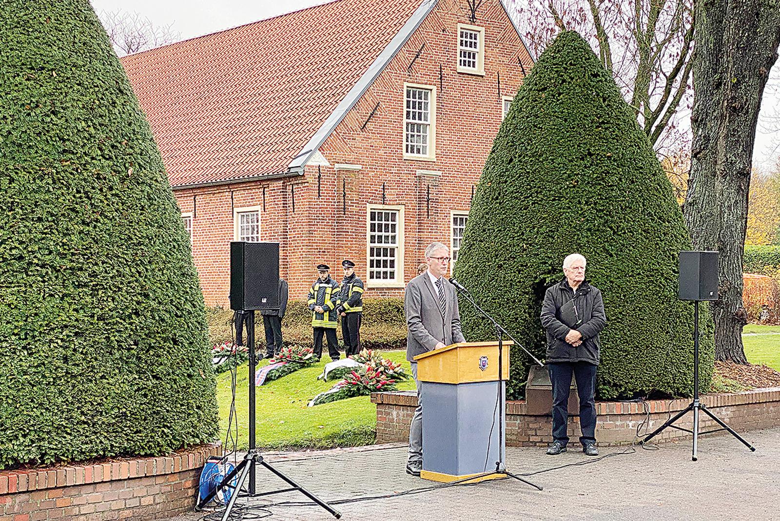 Am Denkmal in der Neuen Straße in Weener sprachen Bürgermeister Heiko Abbas (am Pult) und Pastor Bernd Passarge anlässlich der Gedenkstunde zum Volkstrauertag.  © Fotos: Kuper