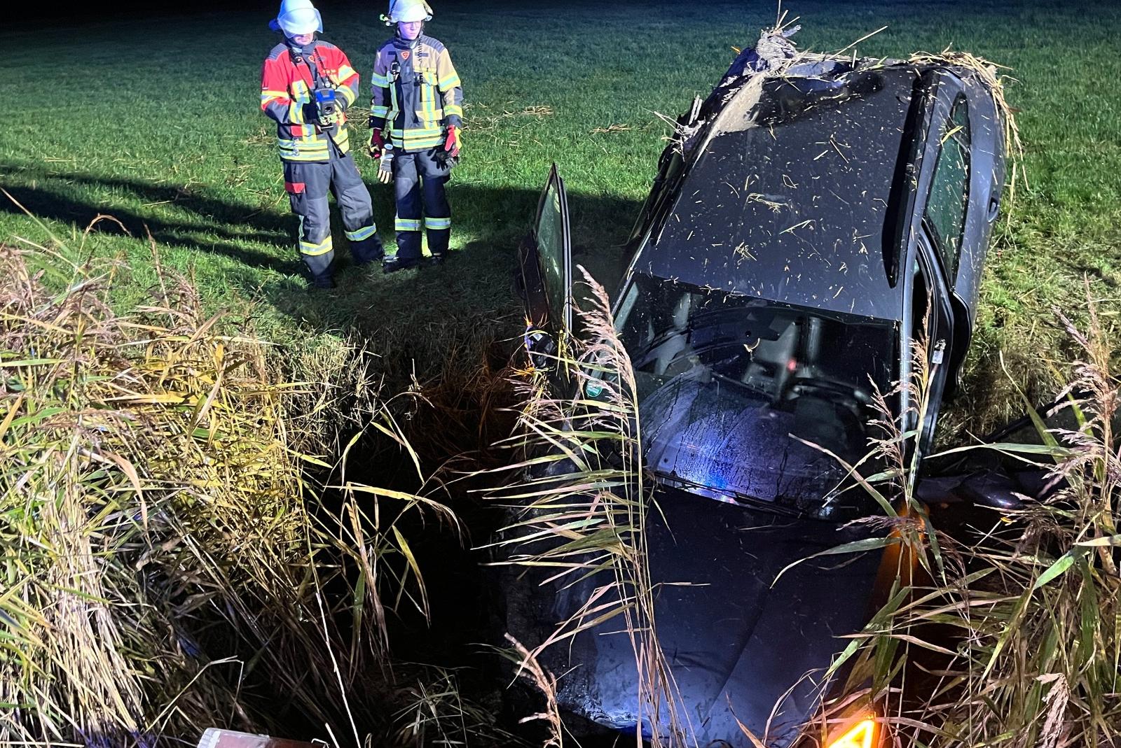 Das Auto landete nach dem Unfall im Graben. © Feuerwehr Krummhörn