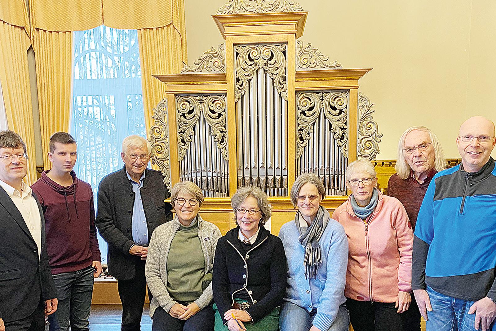 An der kirchenmusikalischen Fortbildung an der Ahrend-Orgel im Organeum wirkten mit (von links) Winfried Dahlke (Dozent), Lasse Heidotting (Hoogstede), Friedrich Engelke (Hamburg), Gabriele Blum (München), Dagmar Lübking (Dozentin), Silke Greiber (Loga), Henni Emme (Wilsum) sowie aus Nordhorn Gerhard Schulte und Dirk Baasner. © Foto: Kuper