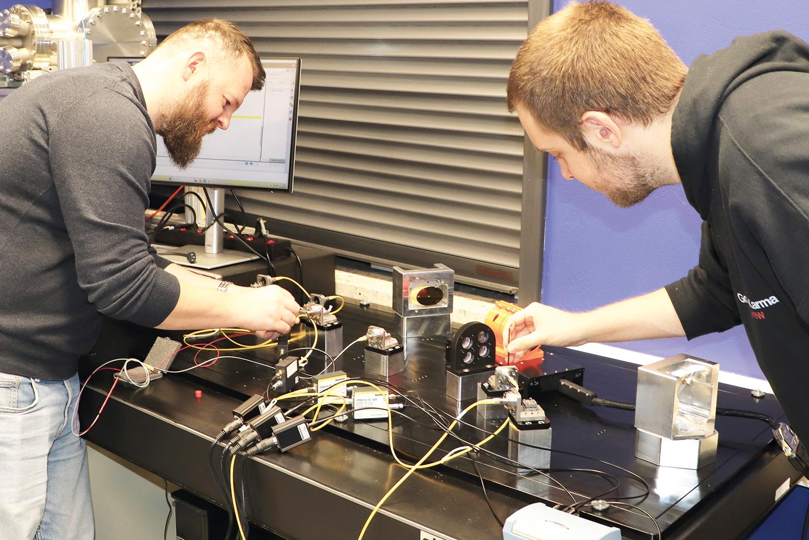 Die Studenten Viljon Sekseni (links) und Kersten Mumme (Engineering Physics, 5. Semester), bereiten derzeit die Mess-Station im Hochschullabor vor. Mit dieser soll der Laserfrequenzkamm geprüft und anschließend für die Kalibrierung genutzt werden. © Foto: Hochschule Emden/Leer