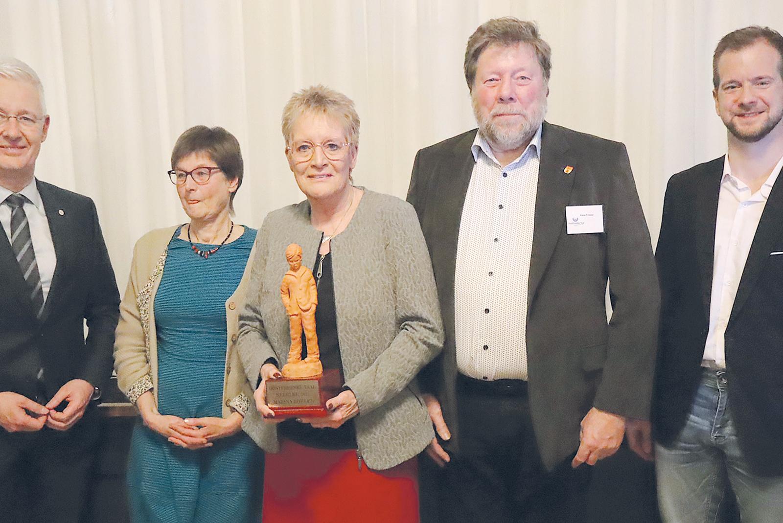Marina Bohlen (dritte von links) für ihre Verdienste um die Plattdeutsche Sprache mit den »Keerlke«-Preis ausgezeichnet. Das Foto zeigt außerdem den Leeraner Landrat Matthias Groote (von links), Laudatorin Angelika Seidel, den Vorsitzenden des Vereins »Ostfreeske Taal«, Hans Freese, sowie Festredner Jan Aden. © Foto: Ammermann